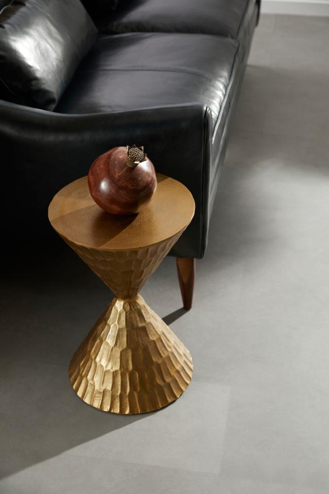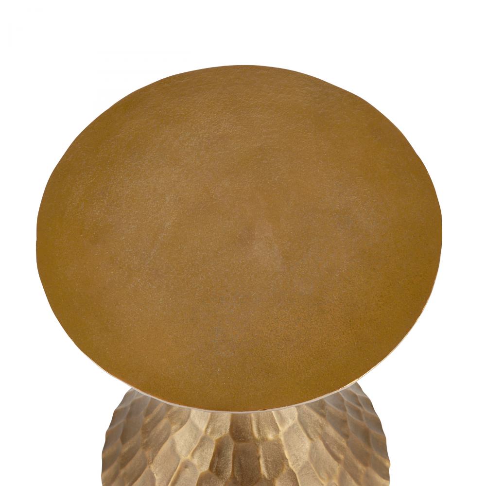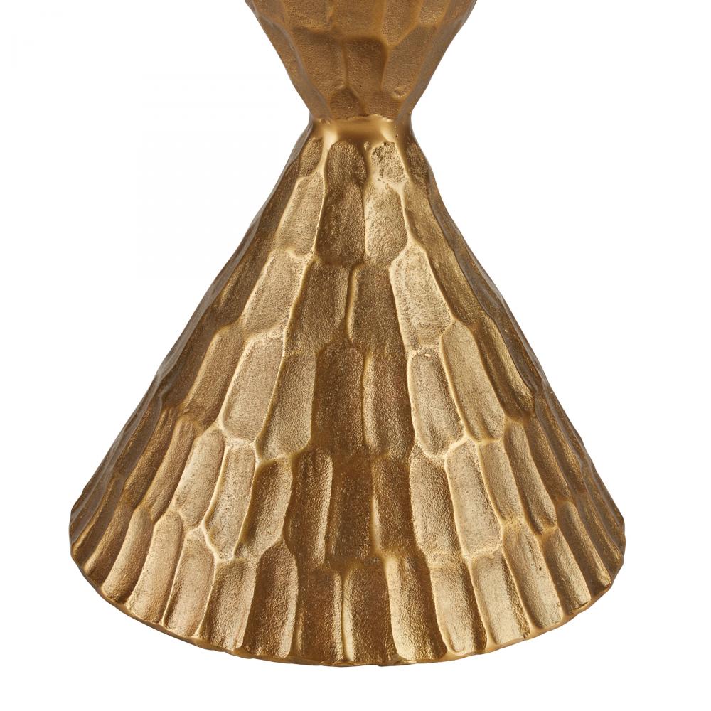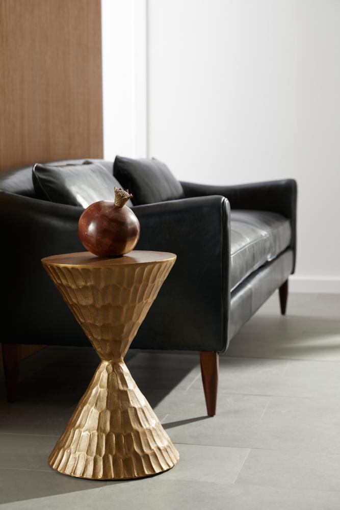 Our cast aluminum accent table is dynamically tapered and finished with a hammered, feathered texture and shining antique brass finish. With a shape inspired by an hourglass, the substantial base and smooth top were designed to enhance any seating area with texture and shine. Finish will vary.