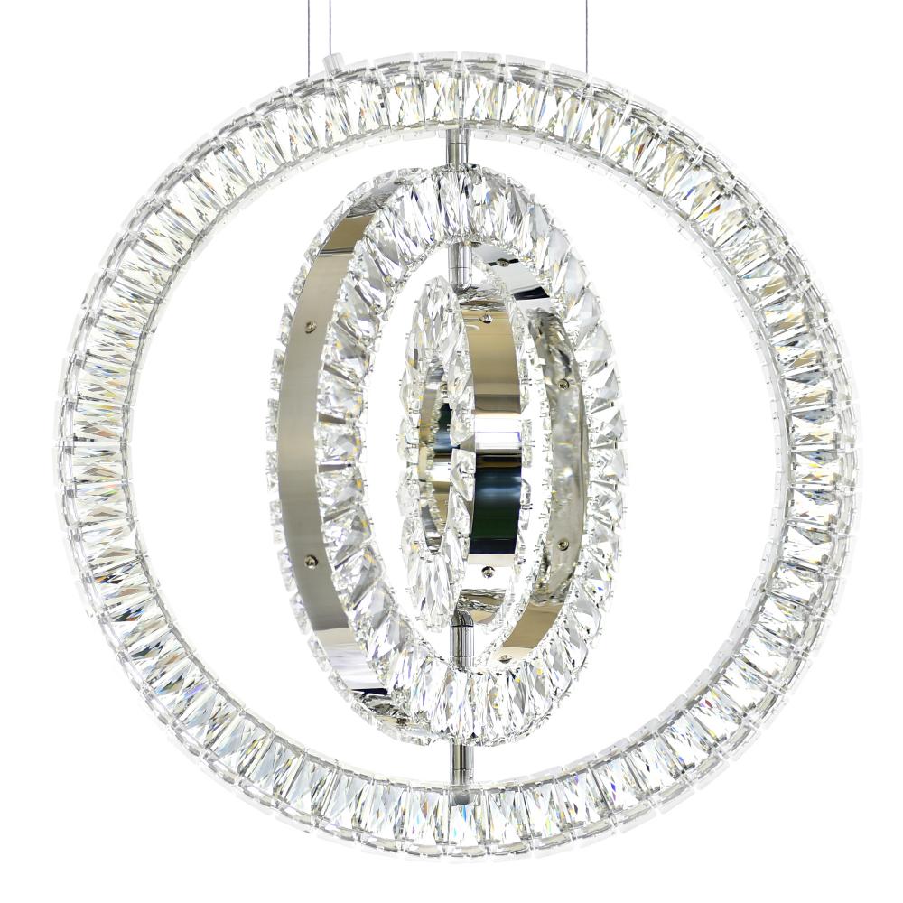 This breathtaking Celina 20'' Modern LED Chandelier with Chrome Finish is a beautiful piece from our Celina Collection. Designed to bring elegance and playfulness to your space, this chandelier features three crystal-lined rings arranged in a striking circular pendant. The chrome finish adds a sleek modern touch, while the integrated LED lighting ensures energy-efficient illumination. Ideal for foyers, dining rooms, or living spaces, this fixture adds a refreshing sense of movement and luxury. Finish: Chrome Light Count: Integrated LED (3 rings) Light Source: LED, No Bulb Required Adjustable Hanging Height: Yes Material: Metal and Crystal Style: Modern / Contemporary