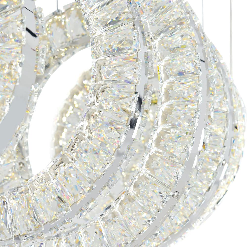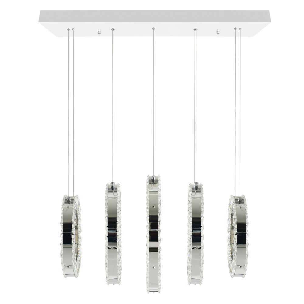 The Celina LED Chandelier redefines modern lighting with its striking 26-inch linear design in gleaming chrome. The rectangular canopy holds glittering crystal rings in perfect formation, creating a captivating display of light and refinement. This pool table and island light delivers just the right amount of extravagance - impressive without being overwhelming. Suspend a pair over an extra-long kitchen island to transform your premium food preparation area into a spectacular entertainment space, or use it to illuminate game tables with sophisticated style. The integrated LEDs provide brilliant, energy-efficient lighting that highlights both the crystals' sparkle and your space's functionality, making this fixture the perfect blend of contemporary design and timeless elegance.