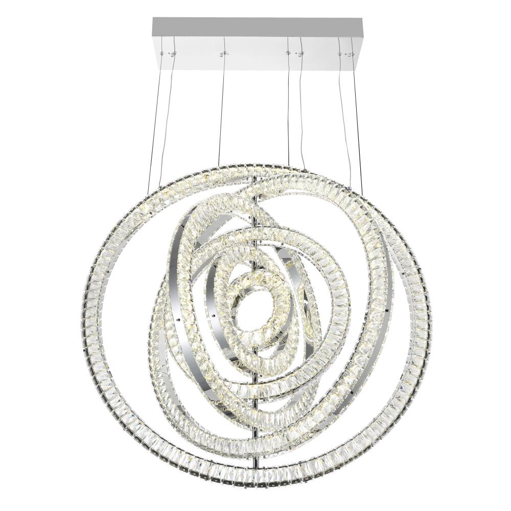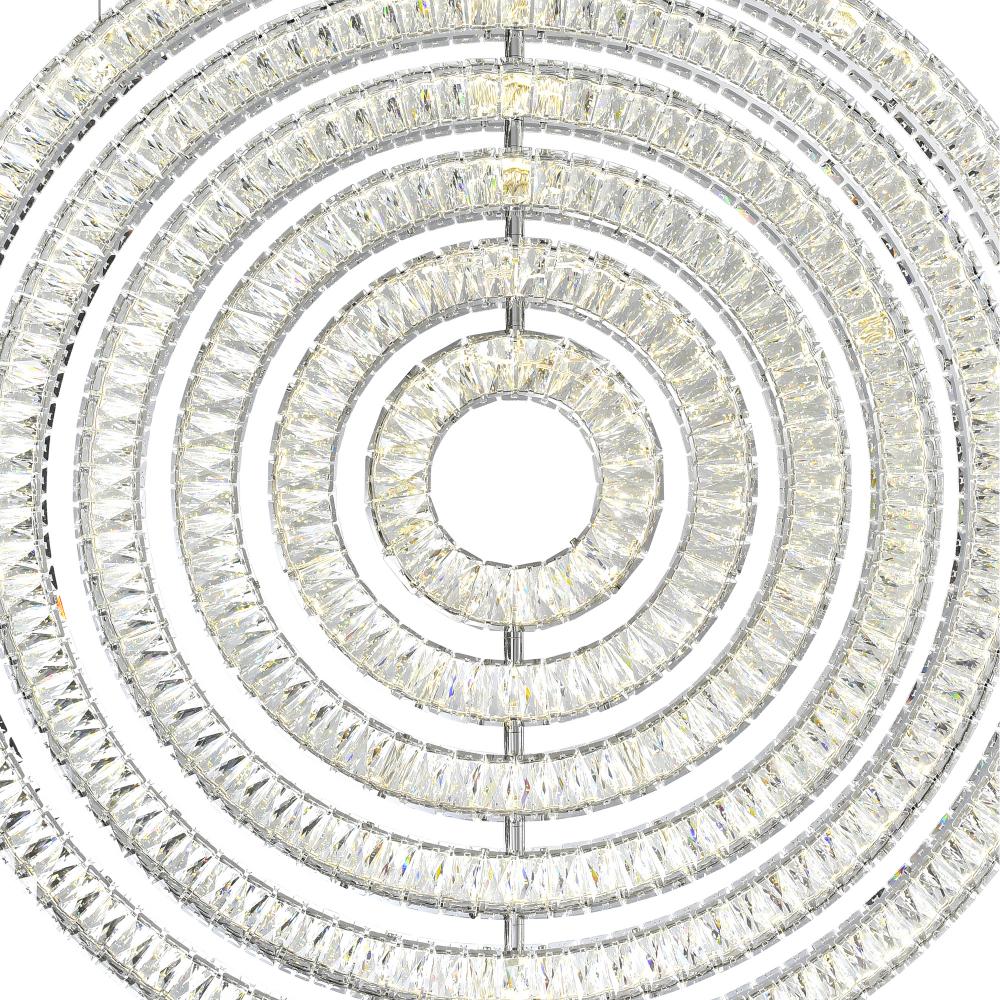 This breathtaking Celina 37'' Round LED Chandelier with Chrome Finish is a beautiful piece from our Celina Collection. Designed to reinvent and elevate your living space, this uniquely shaped chandelier features a circular pendant with a silhouette that evokes the form of an archery target. The glittering design is suspended from a chrome-finished canopy and fitted with integrated LED lights for energy-efficient brilliance. Perfect for contemporary foyers, dining rooms, or living rooms, this fixture allows you to play with shape and scale while maintaining a refined, polished look. Finish: Chrome Light Count: Integrated LED (Layered Ring Design) Light Source: LED, No Bulb Required Adjustable Hanging Height: Yes Material: Metal and Crystal Style: Modern / Contemporary