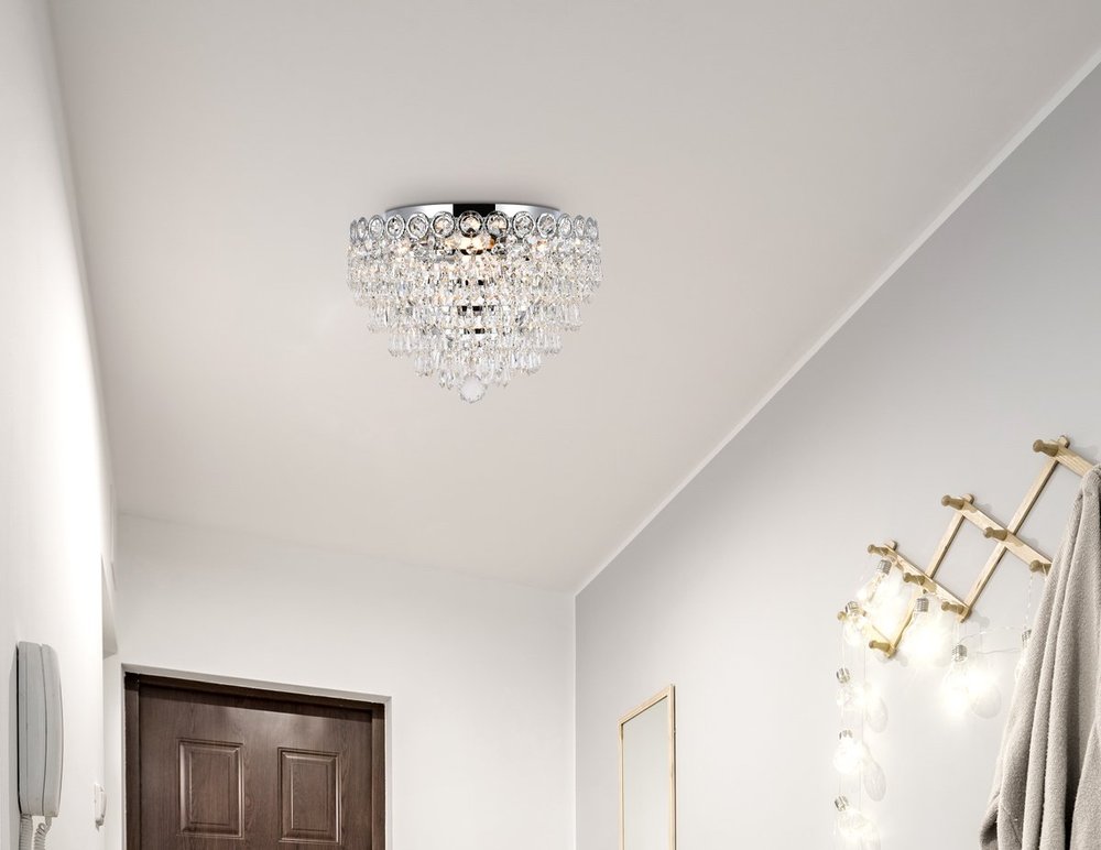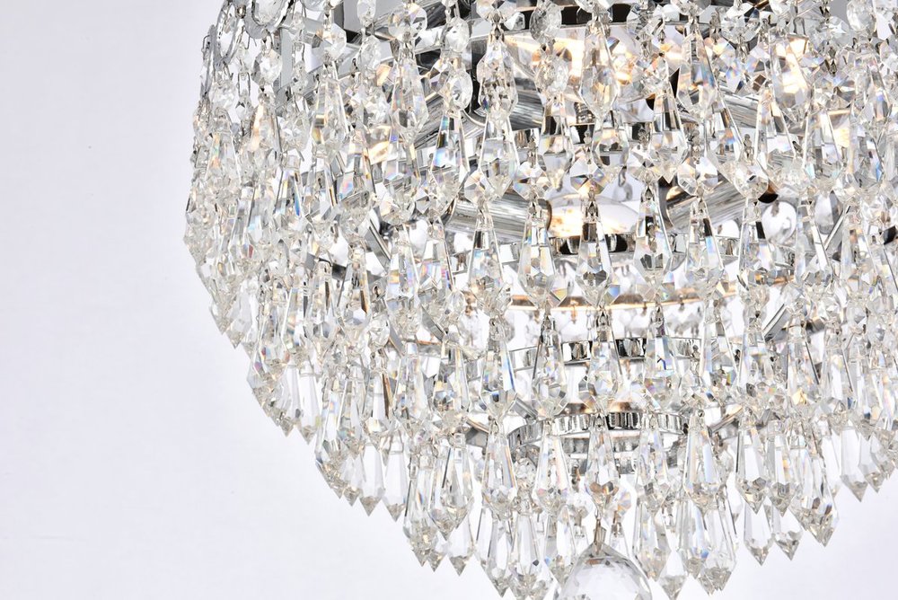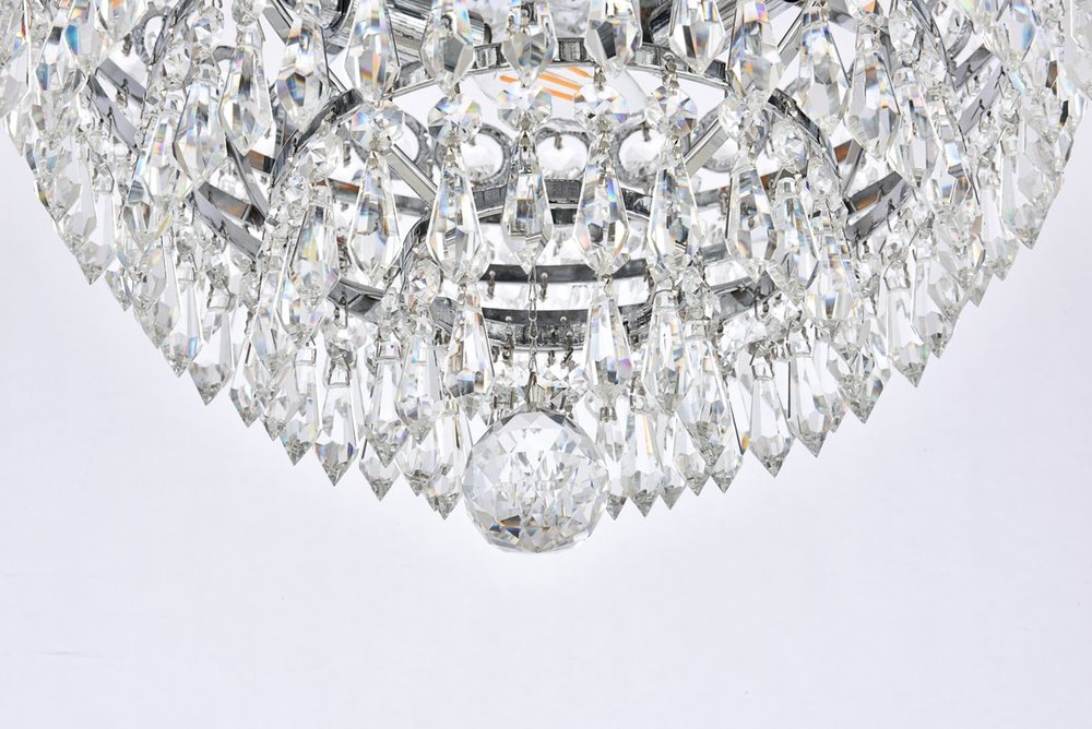 Century collection flush-mount fixtures, inspired by the classic elegance of 19th-century France, offer the versatility and adaptability to add splendor to many areas of your home. The glimmering hemisphere design is ablaze in a profusion of clear crystal octagons and prisms in a wide variety of trims, with the descending tiers all coming together in a Single faceted crystal ball. The candelabra bulbs give off the glowing hue of the frame, finished in gold or chrome.