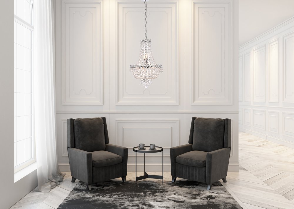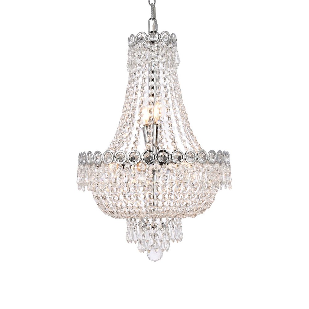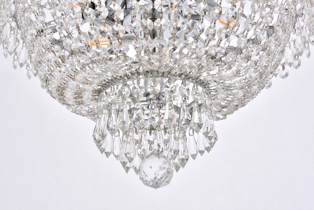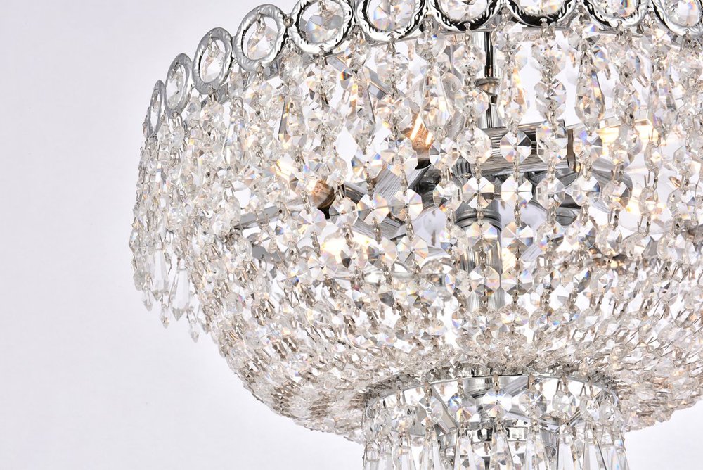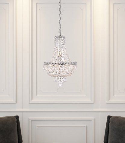 The exquisite Century collection was inspired by the classic allure of 19th-century France. These opulent chandeliers and pendant lamps are highlighted by delicate lines of light-refracting crystals gently flowing down into a bell shape. Each layer is banded with crystal octagons and spear-shaped drops, with the extravaganza coming together at the bottom with a Single crystal ball or a shell completely covered in clear spherical crystal balls. This masterpiece is available in a variety of crystal trims. A column of chrome or gold inside supports soft-glowing candelabra bulbs, creating an effulgence that peeks out between the strands of crystals.