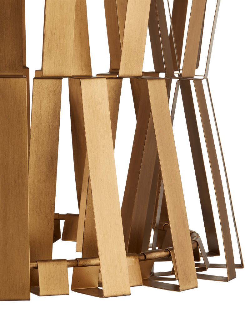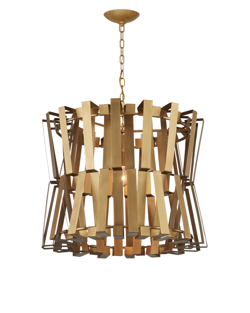 As complex as a profile gets, the Chaconne Brass Chandelier has a circumference ringed in folded metal straps. Each piece is bent seven times to achieve the shape that is then wrapped around the frame. This is a labor-intensive process that takes a tremendous amount of concentration to ensure that the interconnecting straps end up the exact same length. Brightening the overall composition is the brass finish. Adjustable from 28.5" to 96.5" with use of included chain/rod kit/cable. If your space calls for a longer drop, additional chain/rods/cable is available for purchase.