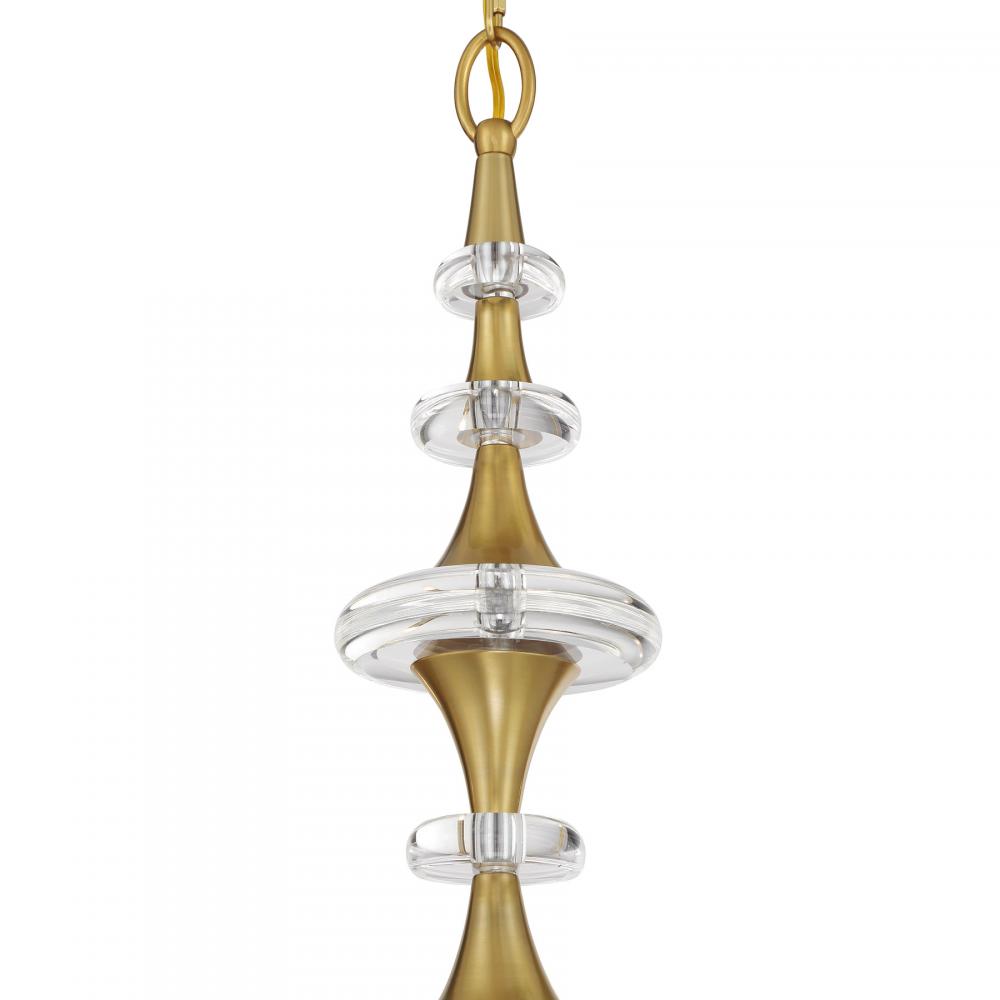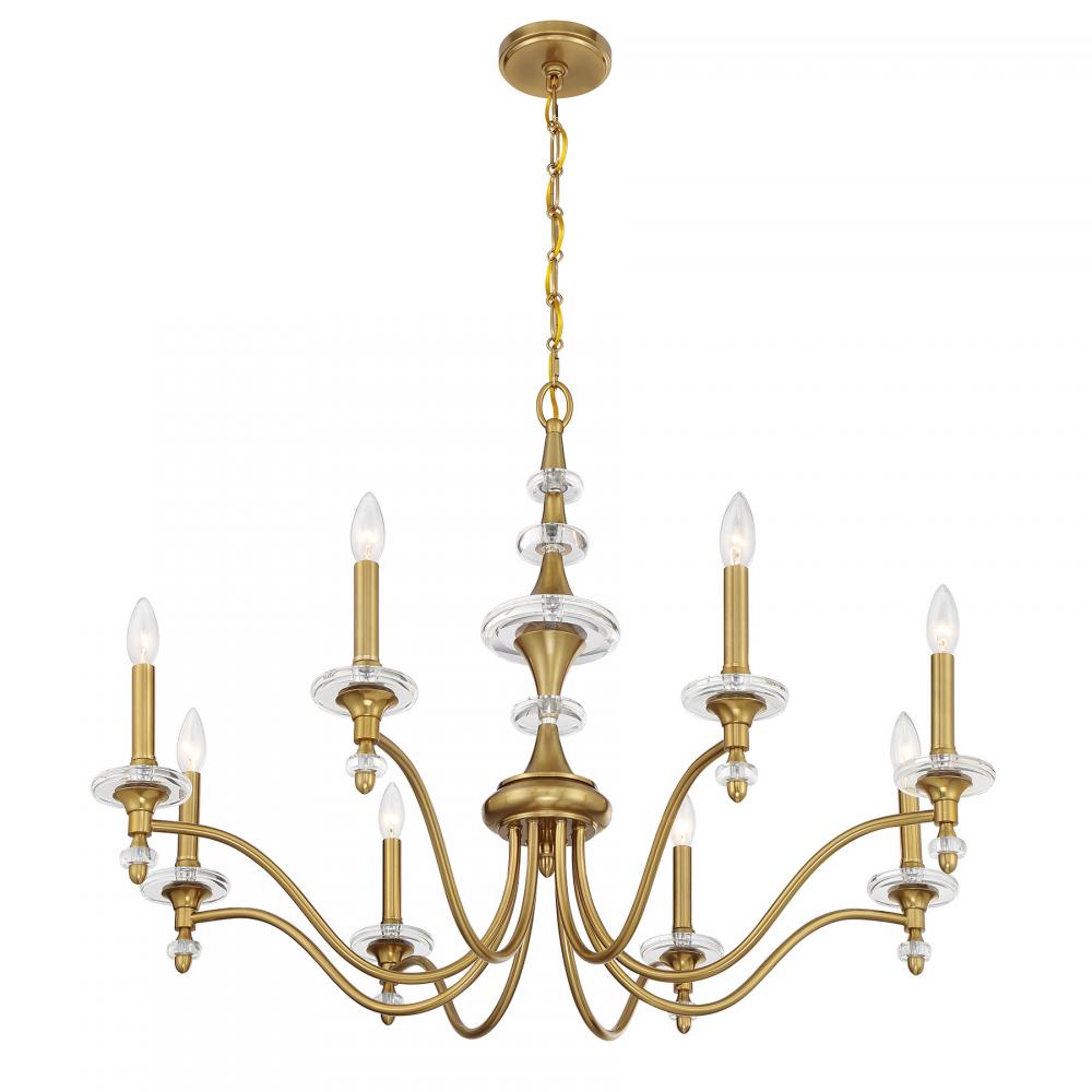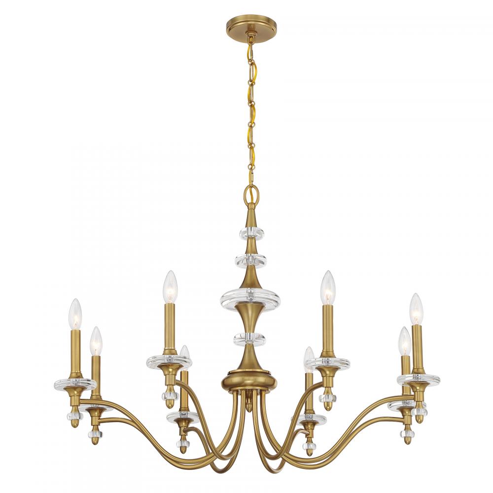 A timeless lighting look is freshened up with chic K9 crystal accents in the Savoy House Champlain 8-light chandelier. The simple elegance makes it a stylish selection for adding a touch of brightness to any room and the Warm Brass finish pairs perfectly with the K9 crystal. Champlain is 26" in height and 35" in width. It uses eight candelabra size bulbs of up to 60 watts per bulb. Bulbs not included. Comes with 120" of chain.