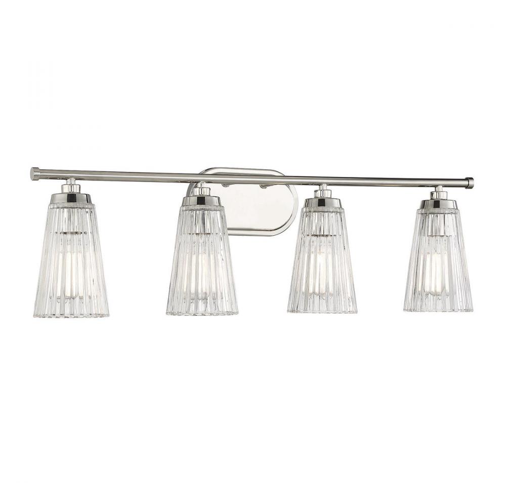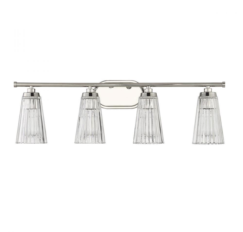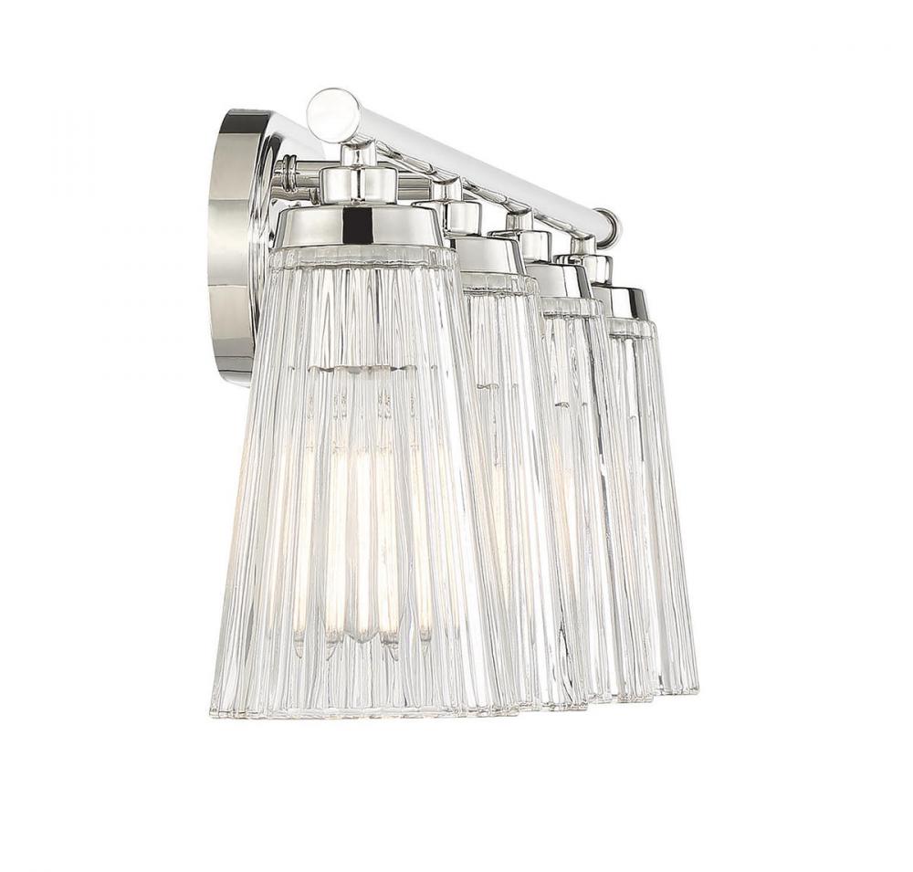 Textured, eye-catching shades of clear ribbed glass take center stage in the Chantilly 4-light bathroom vanity light from Savoy House. Finished in polished nickel. Chantilly is 10" in height and 30.5" in width. It extends 7" from the wall. Uses four standard size bulbs of up to 60 watts per bulb. Damp area rated.
