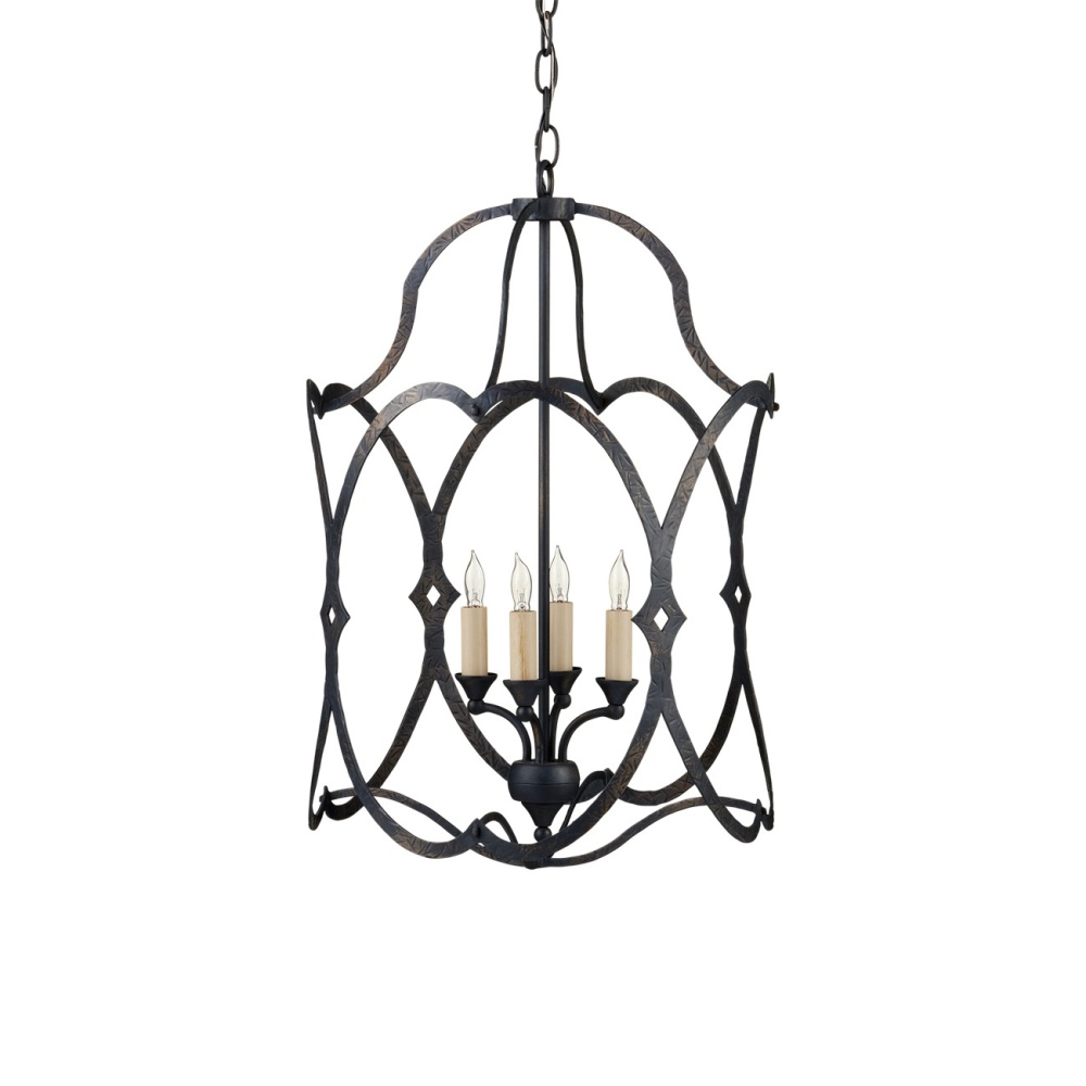 This exquisite work of wrought iron twists and turns to deliver a lithesome shape treated to a lovely French black finish. Where the arcing ovals meet, tiny diamond shapes bring added charm to the four-light fixture. This small version of the Charisma Lantern invites classic Italian flair into interiors. We offer this fixture in a larger lantern that has just as winsome a personality as this design does.