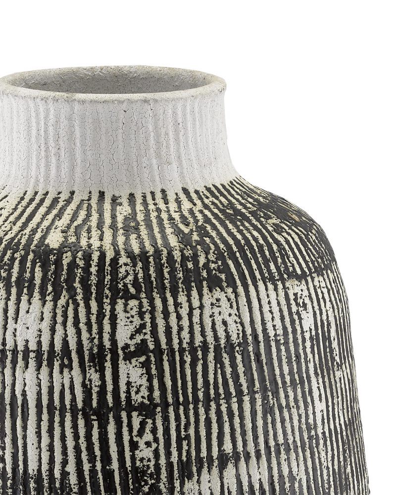 The Chartwell Urn is made of hand-thrown terracotta with a surface treatment meant to bring the black urn powerful patina. The striations in the surface are texturally rich.