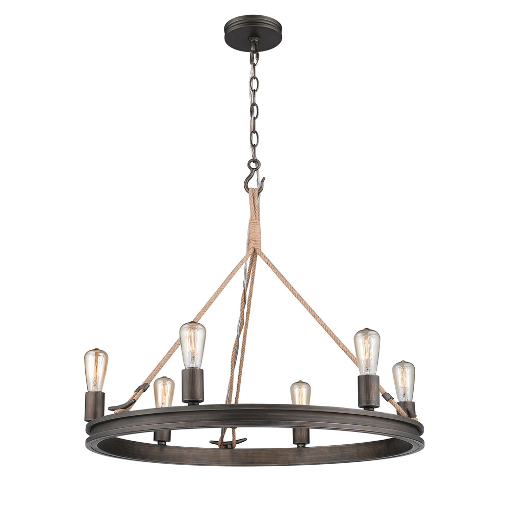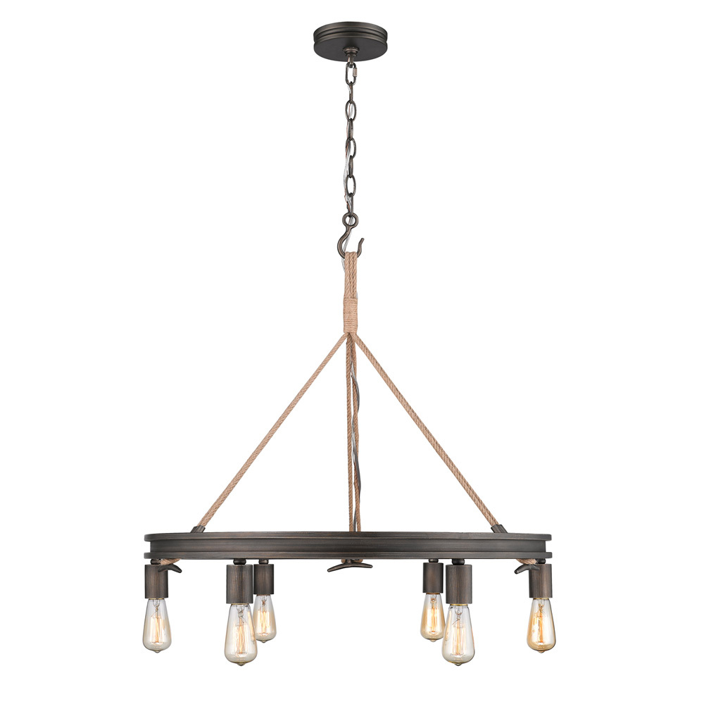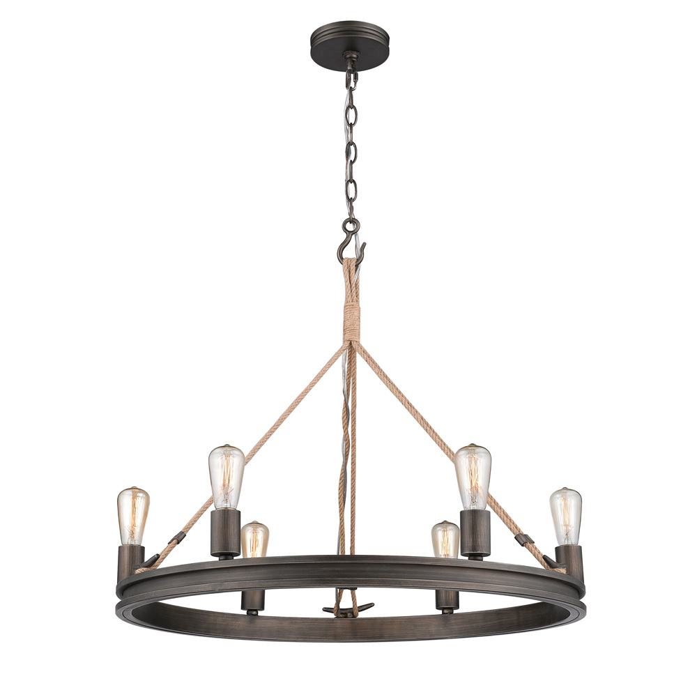 Inspired by the sea, this coastal collection features a simple design with authentic, nautical details. Tied in sailor's knots, woven ropes loop metal cleats before being suspended from maritime hooks. The contrast between the available finish options and texture of the rope and metalwork creates visual interest. Created to be hung with the lamps facing up or down, the transitional fixtures are versatile. This look is perfect for seaside retreats, casual lofts, and rustic bungalows. This 6-light chandelier is comfortably sized for intimate dining and living areas.