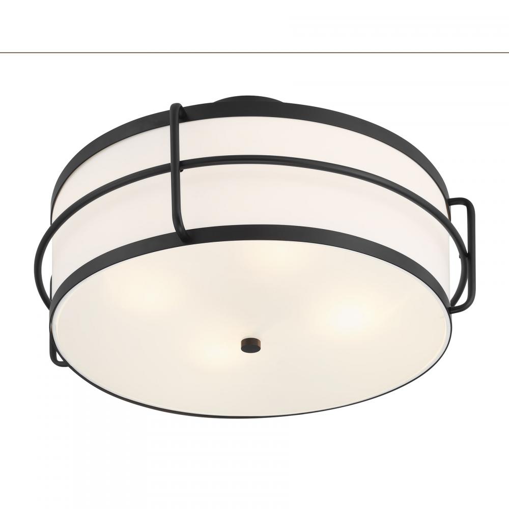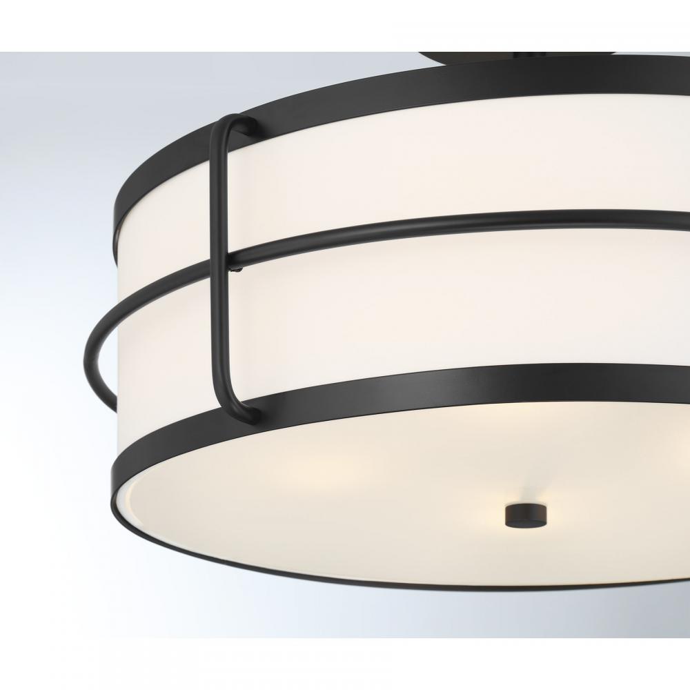 The Savoy House Chauncey 4-light semi-flush mount proves that utilitarian style can be glamorous, too! It showcases a white fabric shade that is accentuated by sleek, chic cage detailing finished in bold Matte Black. Chauncey is 12.25" in height and 22" in width, making it ideal for illuminating larger spaces. It uses four standard size bulbs of up to 60 watts per bulb. Bulbs not included.