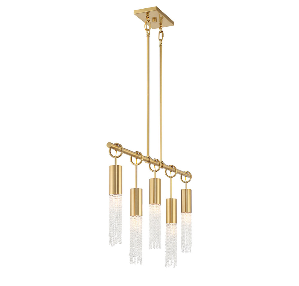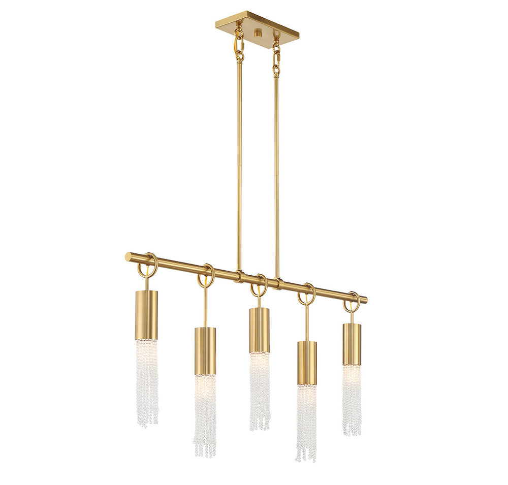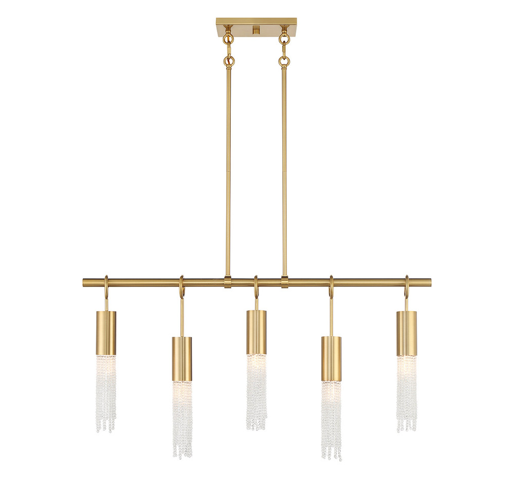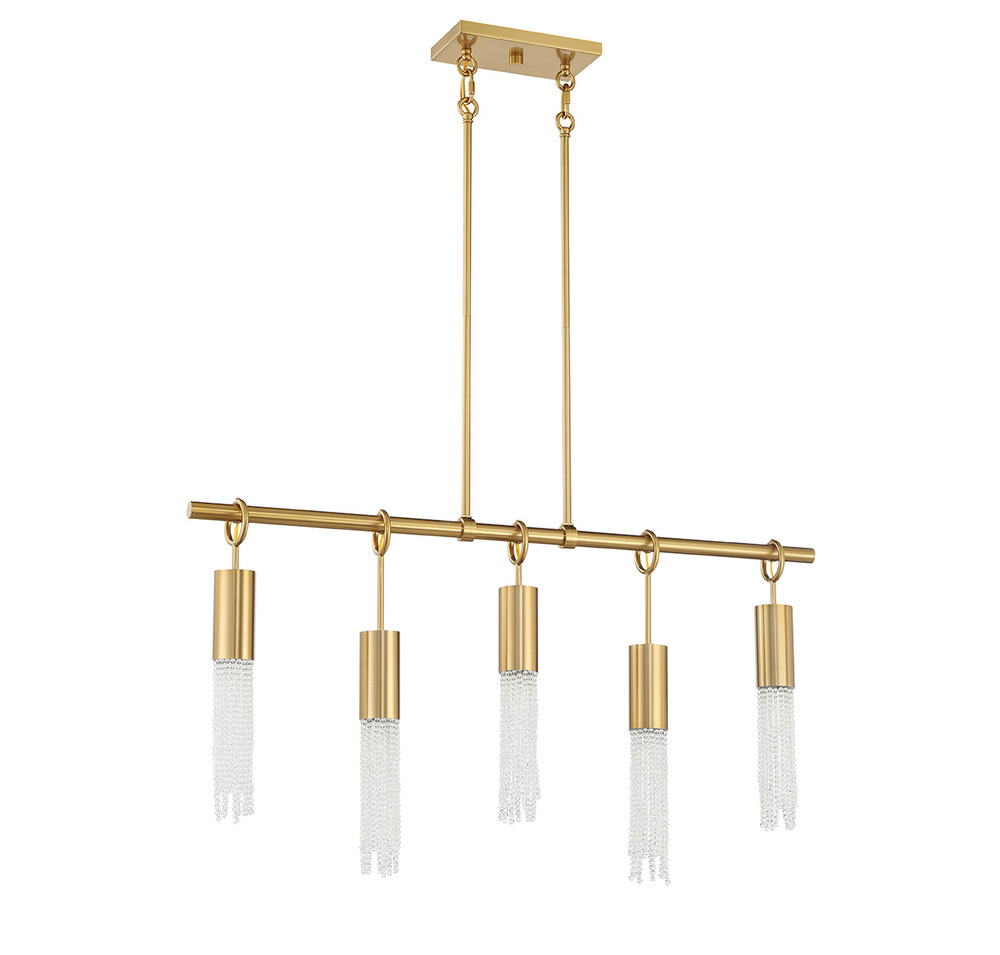 The Savoy House Chelsea 5-light trestle brings understated elegance and sparkle to kitchen islands, long dining room tables and more. Each light socket, finished in beautiful Warm Brass, is adorned with cascading strands of clear crystal beads that amplify the shimmer and shine. Chelsea is 40" in length, 5" in width and has an adjustable height ranging from 20.5" to 74.5". It comes with eight 12" downrods and two 6" downrods. Uses five standard size bulbs of up to 60 watts per bulb. Bulbs not included.