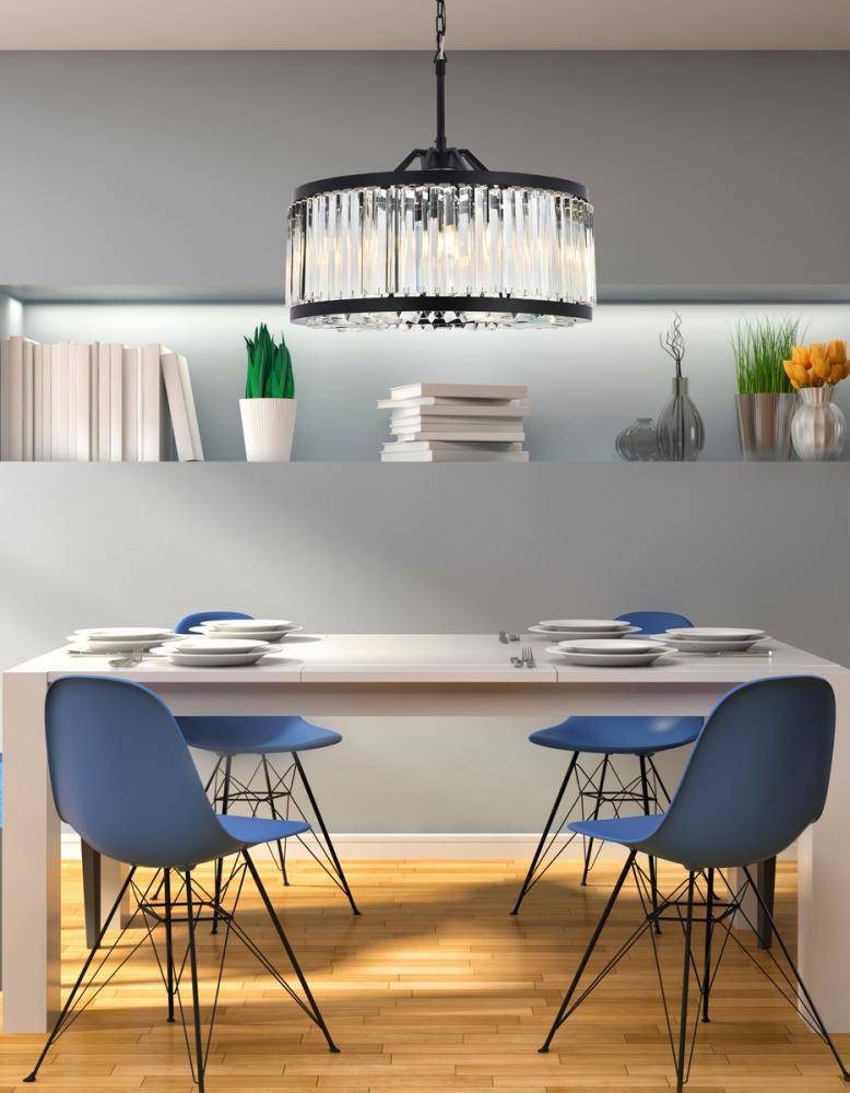 An infinity of light, caught in a circle of crystal bars in clear, golden teak, or Silver shade, the Chelsea collection will bring a shimmer of brilliance to your home. The circular steel frame in a Matte Black or polished-nickel finish lends subtle strength to this chandelier design. The Chelsea collection adds transitional grace especially to a kitchen, bedroom, or dining room