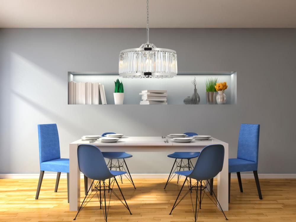 Lamp features a diameter of 28 inches, a height of 15.5 inches, a minimum hanging length of 22 inches, a maximum hanging length of 75.5 inches, and requires 8 candelabra bulbs