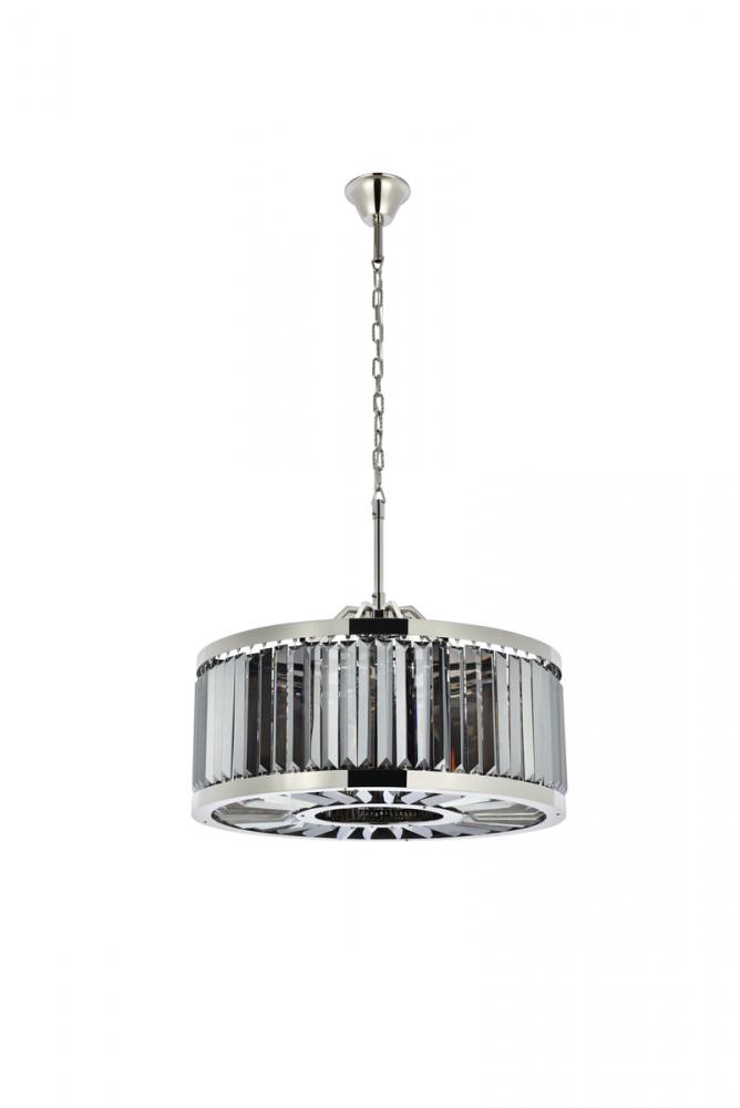 Lamp features a diameter of 28 inches, a height of 15.5 inches, a minimum hanging length of 22 inches, a maximum hanging length of 75.5 inches, and requires 8 candelabra bulbs