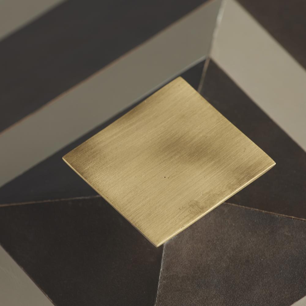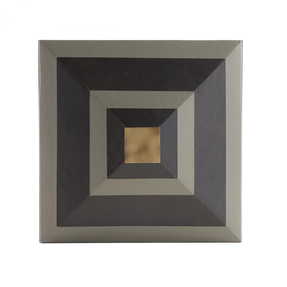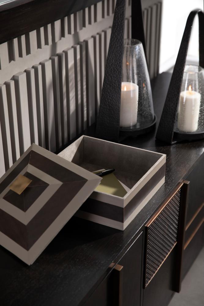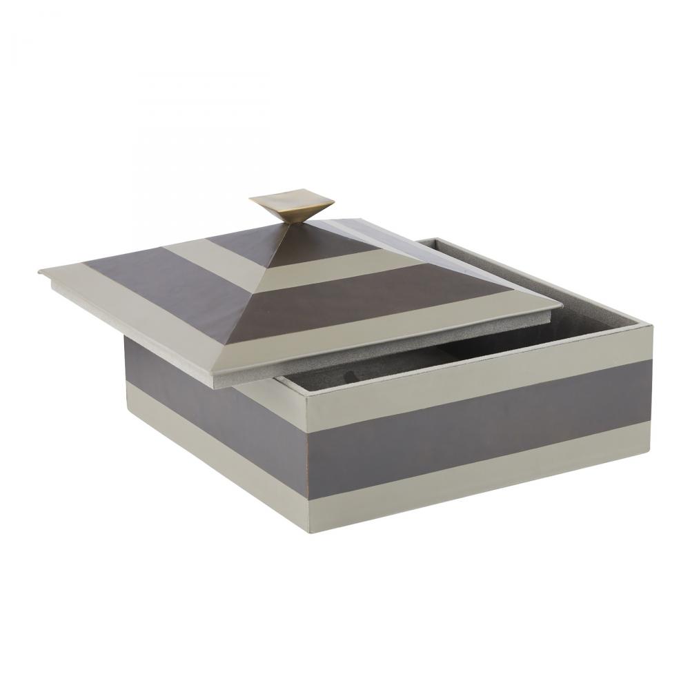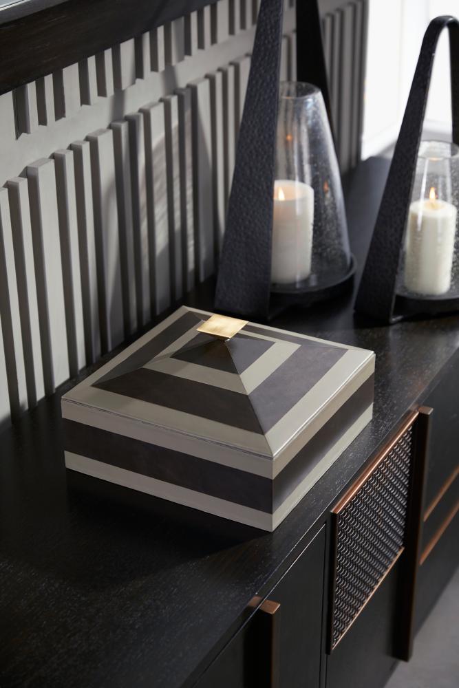 Tonal stripes add a tailored finish to a two-toned dove and graphite leather box. This pyramid-inspired accessory is topped with a bronze-plated handle that reflects its geometric lines. Lined in soft suede. Finish will vary.