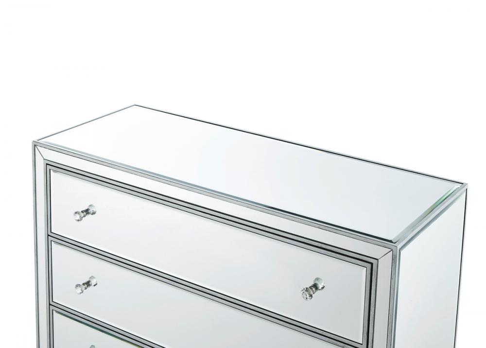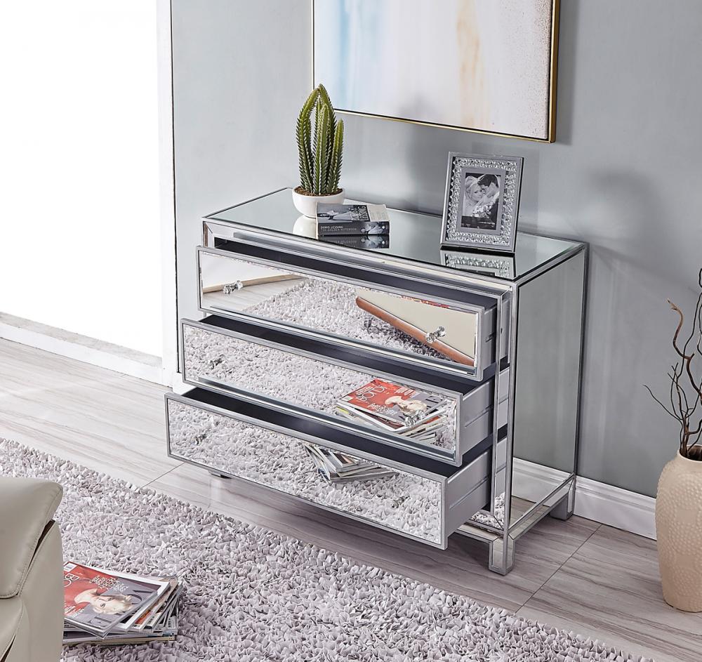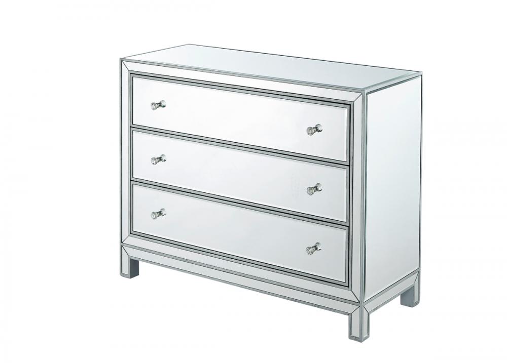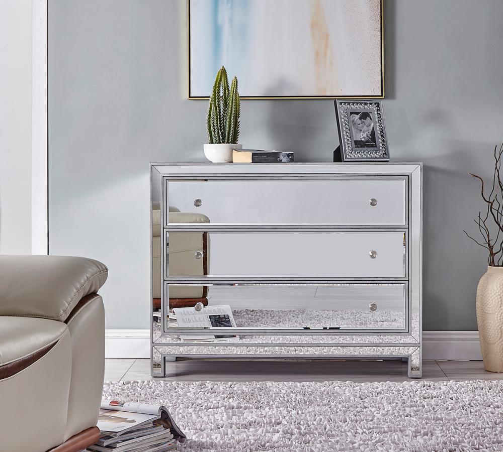 Striking a balance between elegance and functionality, this 40” wide cabinet is likely to be a perfect choice. It has three drawers with generous storage space, glamorous mirror surfaces, and stylish mitered corners. This contemporary chest with drawers is a perfect storage complement whether in your bedroom or any other room in your home. FEATURES: *Reflexion collection *3 large drawers * crystal knobs *Hand paintedSilver finish *Beveled mirror panel *Solid wood trim and legs *Wood drawer glides *Inside lining painted in silver. PRODUCT DETAILS: Measurement W40xD16xH32” *No assembly required *Material in solid wood and engineered wood *1 year limited warranty.