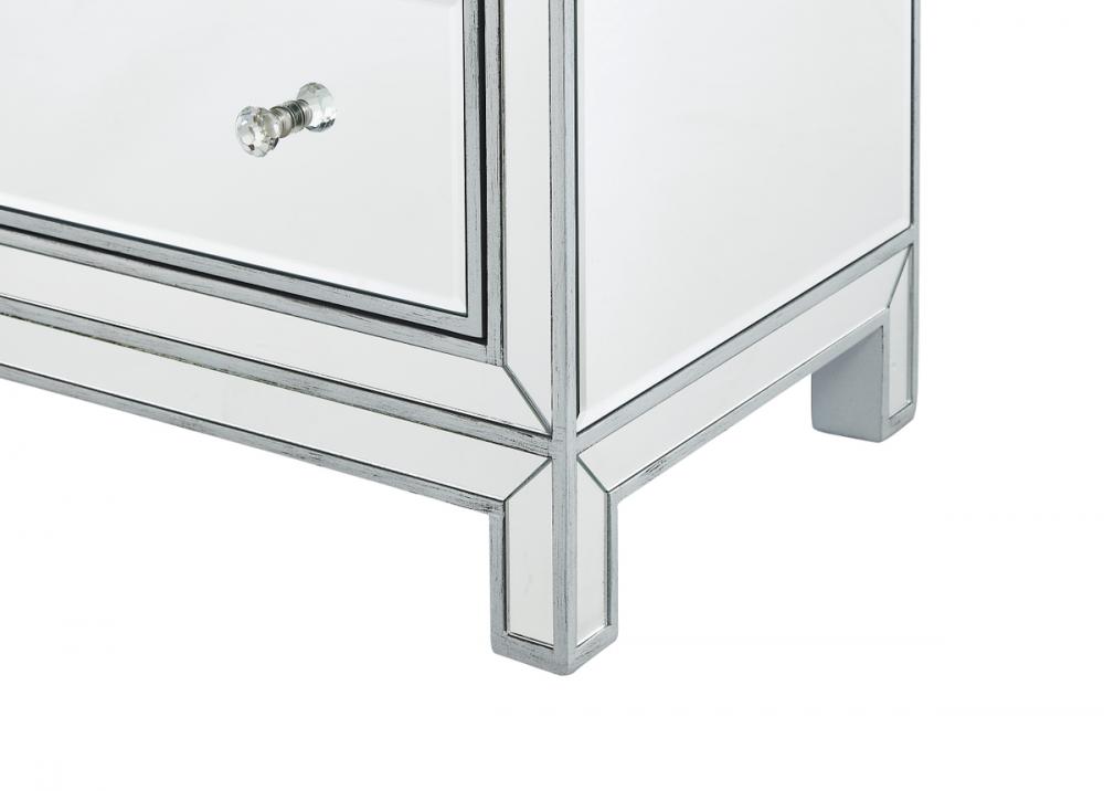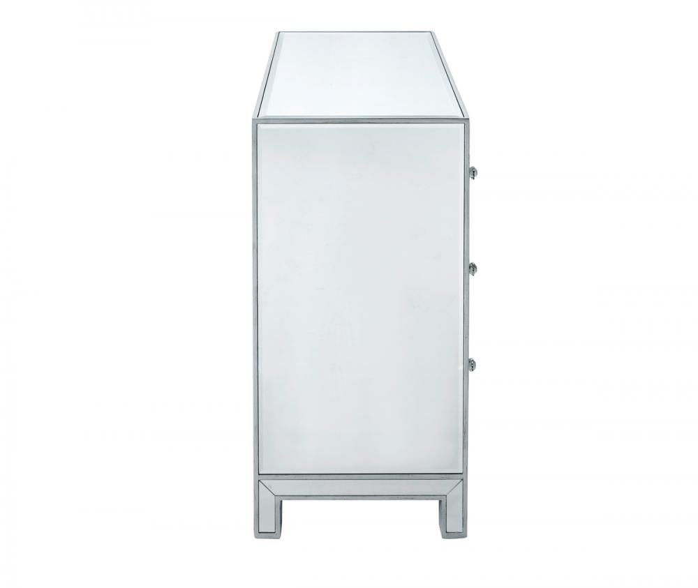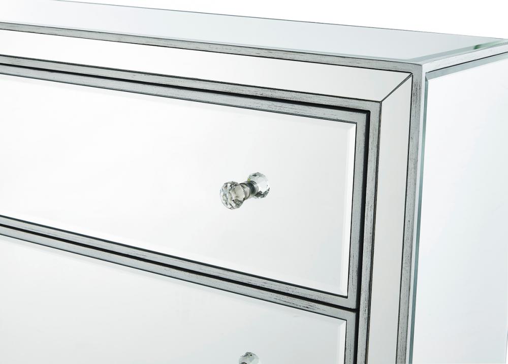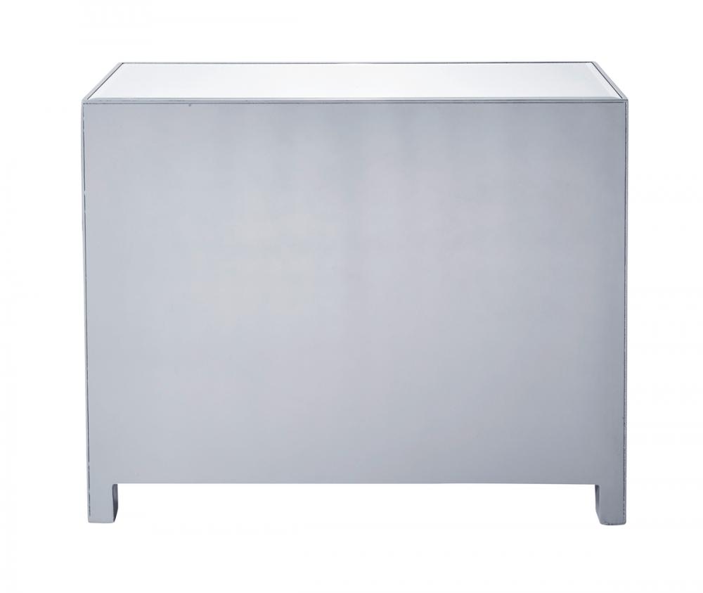 Striking a balance between elegance and functionality, this 40” wide cabinet is likely to be a perfect choice. It has three drawers with generous storage space, glamorous mirror surfaces, and stylish mitered corners. This contemporary chest with drawers is a perfect storage complement whether in your bedroom or any other room in your home. FEATURES: *Reflexion collection *3 large drawers * crystal knobs *Hand paintedSilver finish *Beveled mirror panel *Solid wood trim and legs *Wood drawer glides *Inside lining painted in silver. PRODUCT DETAILS: Measurement W40xD16xH32” *No assembly required *Material in solid wood and engineered wood *1 year limited warranty.