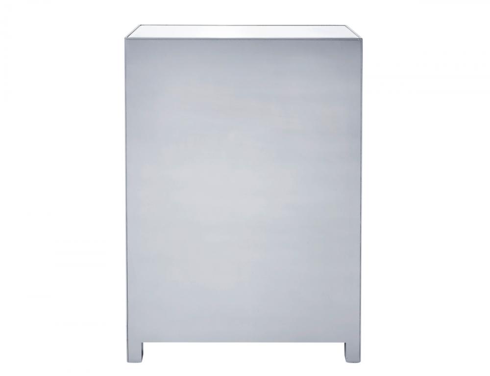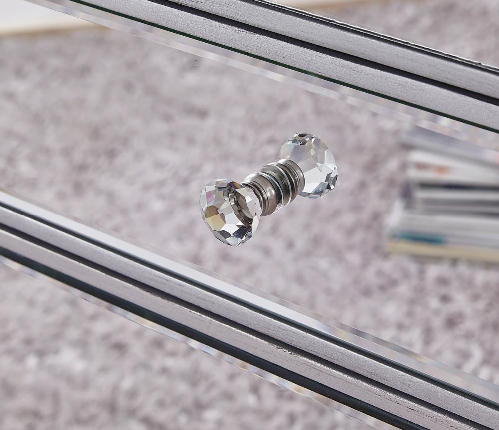A perfect combination of style and functionality, this five drawer dresser provides plenty of storage space. The high quality beveled mirror panels are enhanced with hand paintedSilver trims. The crystal knobs, in addition to the distinctive mitered corners, evoke richness and class! FEATURES: *Reflexion collection *5 drawers * crystal drawer knobs *Hand brushedSilver trim and frame *Beveled mirror panel *Solid wood frame and legs *Wood drawer glides *drawer lining painted in silver. PRODUCT DETAILS: Measurement W34xD16xH48” *No assembly required *Material in solid wood and engineered wood *1 year limited product warranty.