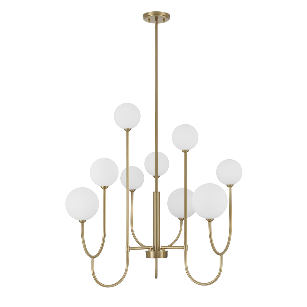 Get a big dose of bubbly, Art Deco-inspired charm with the Savoy House Chester 9-light chandelier. Curving arms support orbs of white opal glass in two different sizes, creating a lively geometric silhouette. A Noble Brass finish adds richness and shine. Chester is 30" in width and has an adjustable height ranging from 34.75" to 70.75". It uses nine G9 bulbs of up to 60 watts per bulb. Bulbs not included. Comes with four 12" downrods and one 6" downrod.