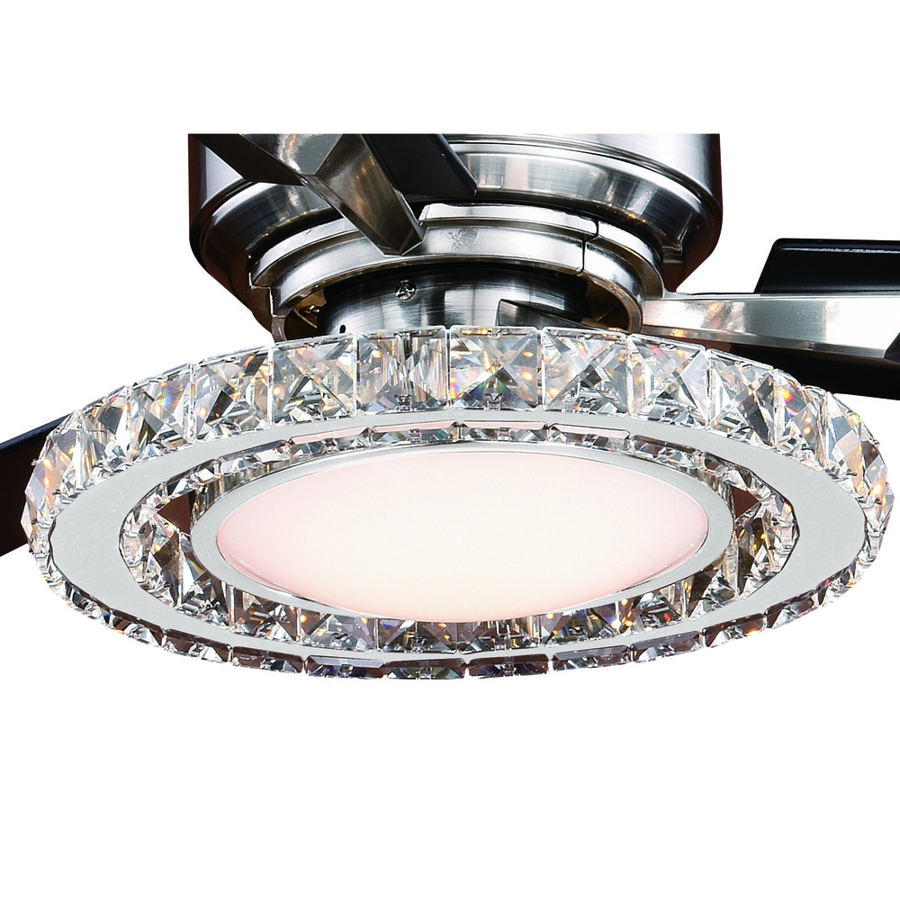 Contemporary glitz is summed up in the Clara fan. A brushed nickel finish is strikingly joined by a dramatic crystal light kit. The ample LED light source creates an unexpected glow of beauty with functional cooling in any modern room of the house. This fan is compatible with sloped ceilings and includes a 6 inch down rod (longer down rods sold separately). Remote control included for added convenience.