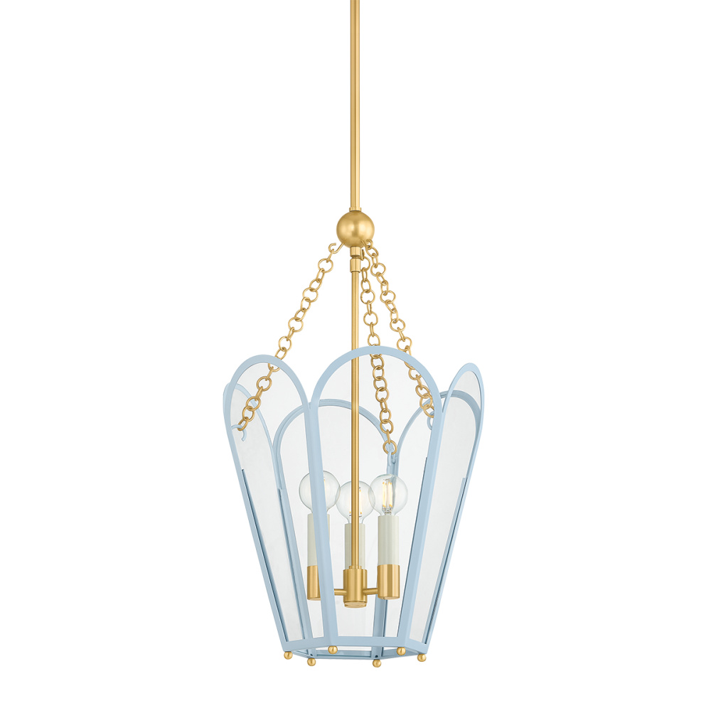 A classic lantern shape is reimagined with the spirit of modern romance. The hexagonal frame of Clarisse features arched glass panels that reveal cream candles. With a mix of Aged Brass and either Soft Bisque or Arctic Ocean finishes, each lantern is a festive celebration of color. Available as a small 3-light or large 4-light design.