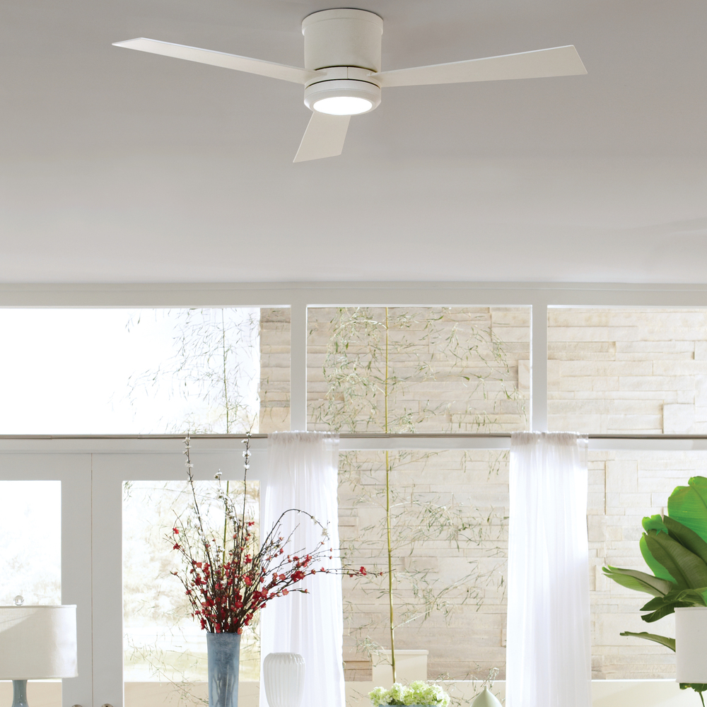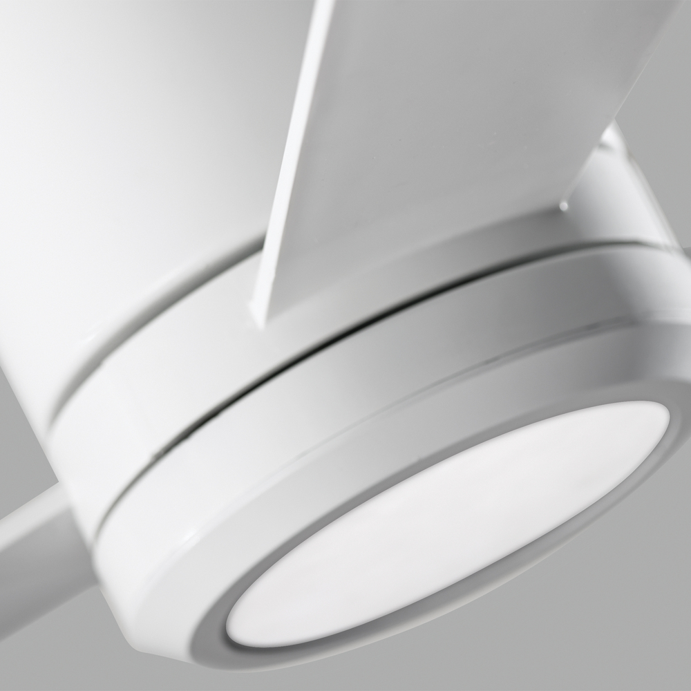 The Sean Lavin Clarity 52 LED in Matte White features a 153.0 X 18.0 3 speed motor with a Twelve degree blade pitch. The Clarity 52 ceiling fan has a sleek, three-blade design that hugs the ceiling and is offered in four finish combinations to suite virtually any decor. The fans blade sweep is 52. A two-in-one remote control (combo hand-held and wall mount) with reverse and dimmer functionality is included.