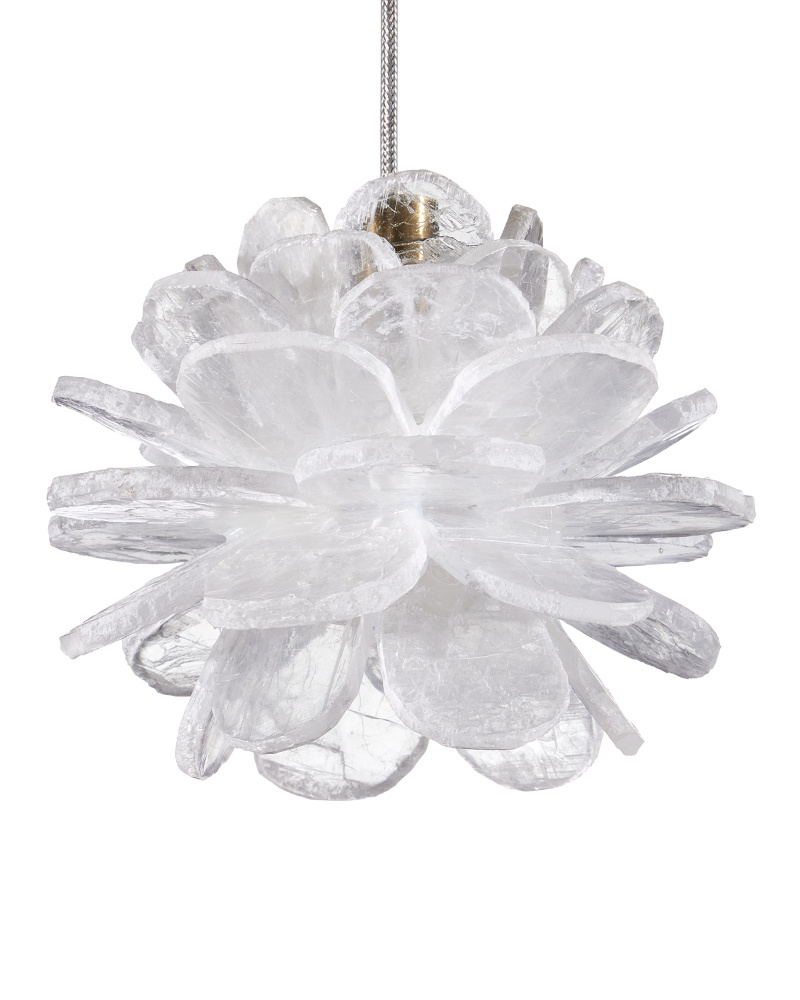 The petite Clarity Pendant looks like a flower with each of its petals made of natural Selenite. The crystal is very reflective so it creates a nice glow when illumination strikes it. The white pendant takes on another aspect of this natural material, as the textural quality of the crystal creates a more dynamic profile. It hangs from a slender cord to keep the design simple. Adjustable from 12" to 125" with use of included chain/rod kit/cable. If your space calls for a longer drop, additional chain/rods/cable is available for purchase.