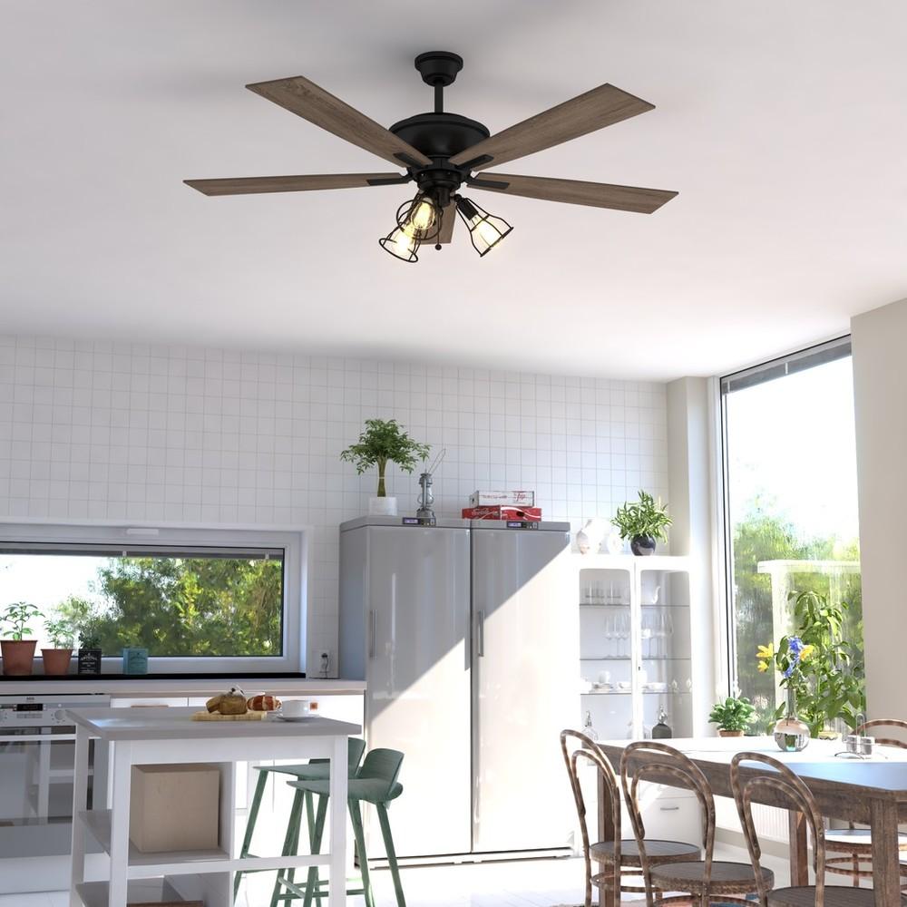 The Clybourn ceiling fan in a bronze finish has a distinct farmhouse or industrial look. The included light kit features 3 distinct wire cage directional lights over dimmable vintage Edison style filament bulbs (included). Attractive reversible driftwood or dark maple blades allow you to change up the look. A pull chain makes it easy to control the speeds. This fan is perfect for any living room, kitchen, or office. Can be alternatively installed without the light kit. It is compatible with sloped ceilings and includes a 6 inch down rod (longer down rods sold separately).