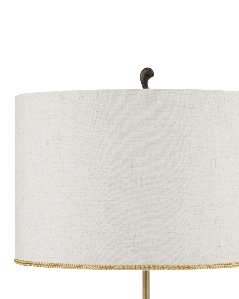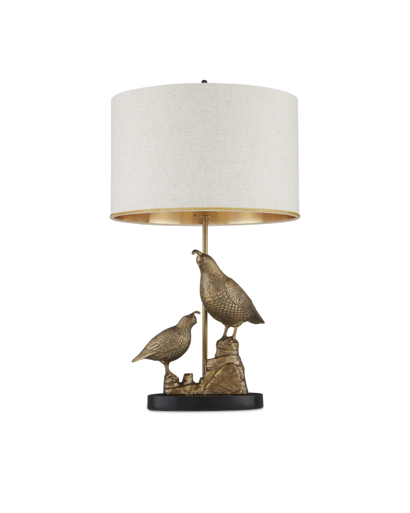When Marjorie Skouras designed the Codorniz Brass Table Lamp, she was inspired by the Mexican quail that roam the meadows and woods of the Yucatan Peninsula that she calls home. The pair of quail and the rocky ledge on which they are perched are fashioned from cast aluminum in an antique brass finish. The black marble base is honed rather than polished and the natural linen shade with gold foil lining has glimmering gold trim on its top and bottom edges. A whimsical design detail is the finial that is shaped like a quail's head-feather.