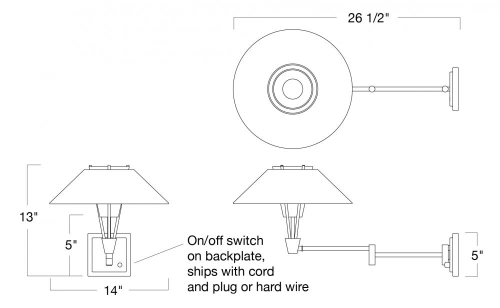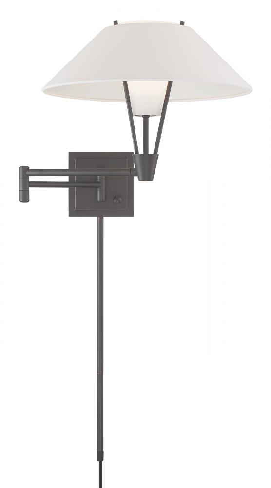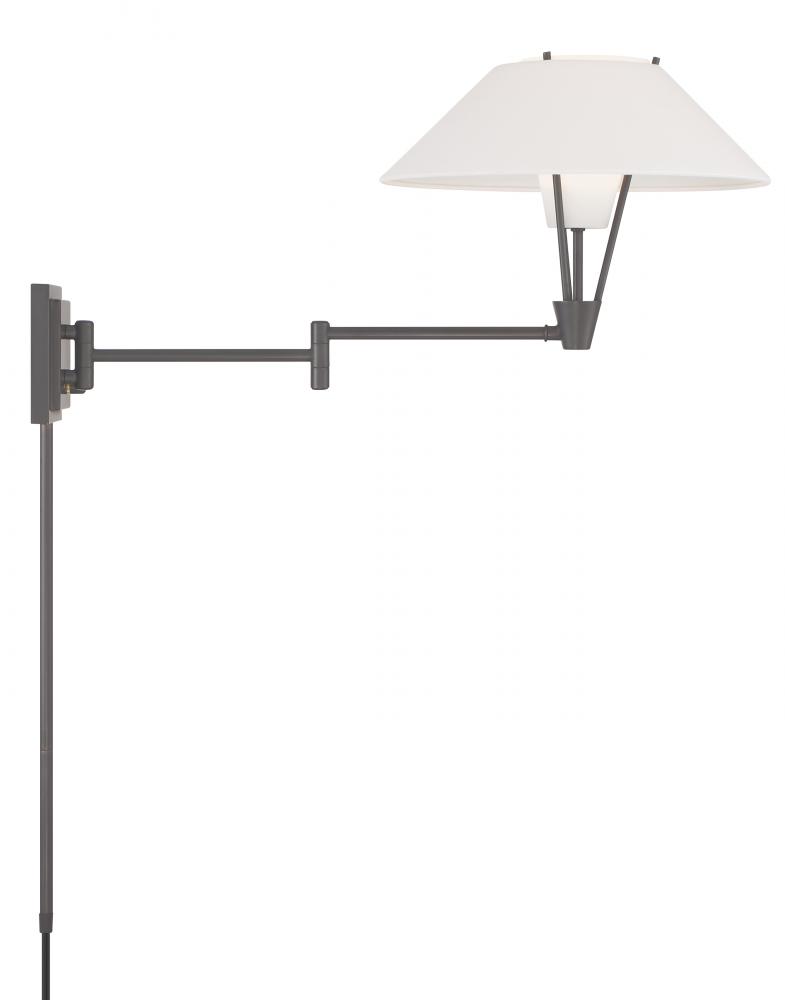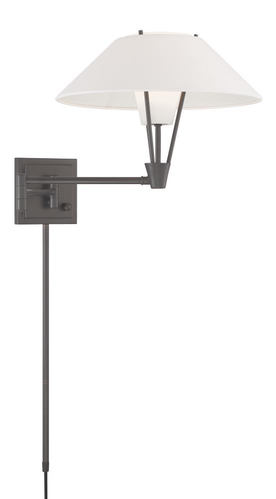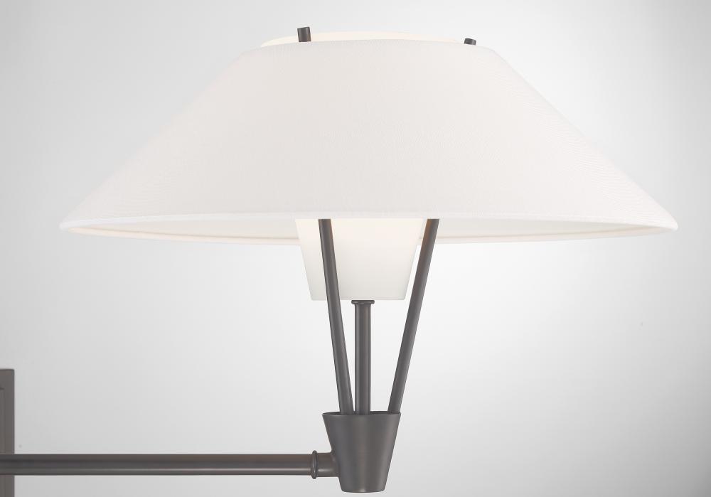 The Cody Swing Arm Wall Sconce has a refined, textured white fabric shade and a frosted glass diffuser giving a layered look to the fixture. Crafted of metal, the clean lines of the frame and backplate give this wall light a subtle air of contemporary elegance. Artful design and attention to detail are showcased through the shade's unique silhouette. Taking a modern approach, the flared shade adds visual interest while an inner frosted glass softly diffuses the light. Functional and decorative, the swing arm extends outward to 26 ¼” so you can focus the light where you need it most. This fixture's uplight design, adjustable length, and double shade make it the perfect lighting choice for reading, accenting art, or illuminating the bedside. Designed to meet your needs, the Cody Swing Arm Wall Sconce can be a hardwire or a plug-in fixture, with on/off switch on the backplate for ease of use. Capable of being dimmed, so you can set your illumination level to suit your space. Requires one 40-watt LED bulb, sold separately.