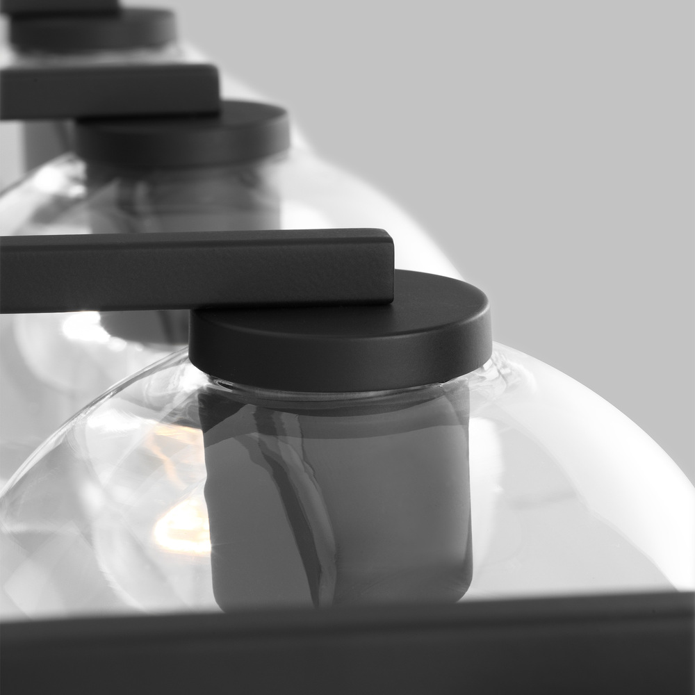 The Codyn four light vanity fixture in Midnight Black is a contemporary take on a classic mid-century design. Clear glass shades with open-ended spheres accent the elongated keyhole strap detail, for a clean look. This minimalist collection relies on subtle details to create visual interest