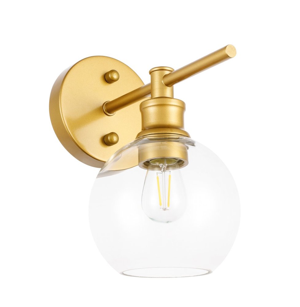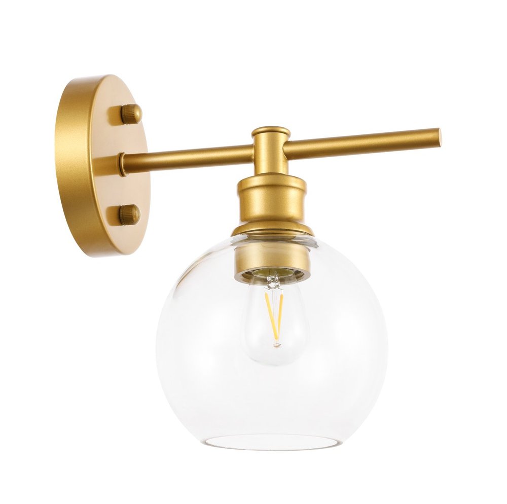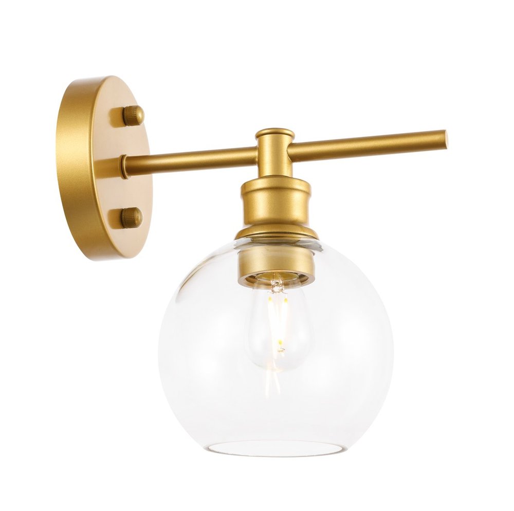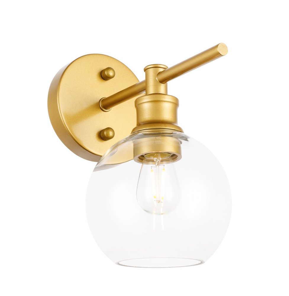 The Collier Collection of lights will be sure to have your guests admire your modern sense of style with the beautiful simplicity of its shape and form. The sleek curvature of the ball shaped shade creates the juxtaposition of intricate simplicity, achieving a style that has both form and function. This wall lamp can be oriented facing up or down, and can shine by itself or paired with another to create an even brighter illumination that will brighten any home. Available in a brass, chrome, or black finish with either a clear or frosted ball glass shade, it is the perfect wall lamp to enhance your bathroom, foyer, or hallways, allowing you to always live in chic and fashionable lifestyle (light bulbs not included).