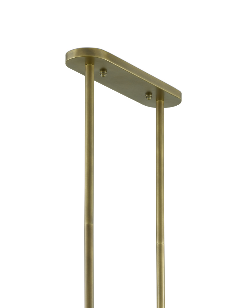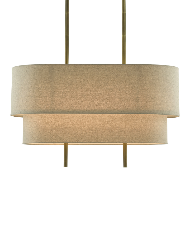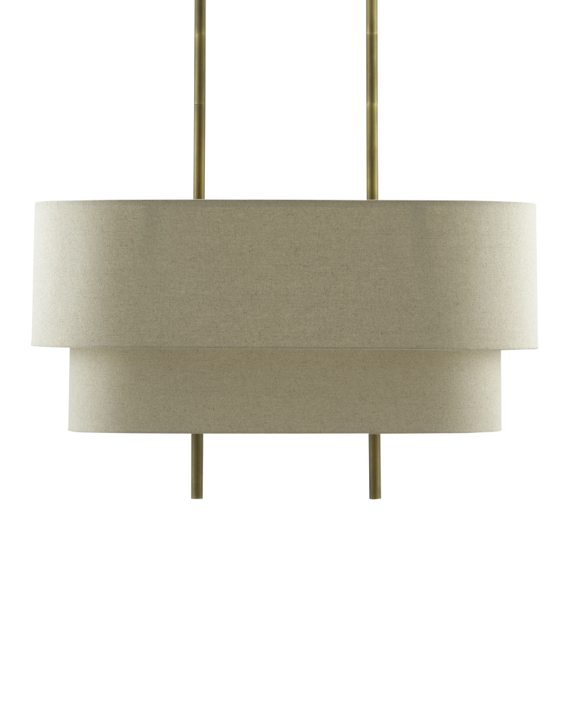 A study in simplicity, the Combermere Rectangular Chandelier has a pared-down profile that makes it one of our most versatile designs. Made of metal in an antique brass finish, the gold chandelier has stacked shades made of linen. Adjustable from 34.5" to 70.5" with use of included chain/rod kit/cable. If your space calls for a longer drop, additional chain/rods/cable is available for purchase.
