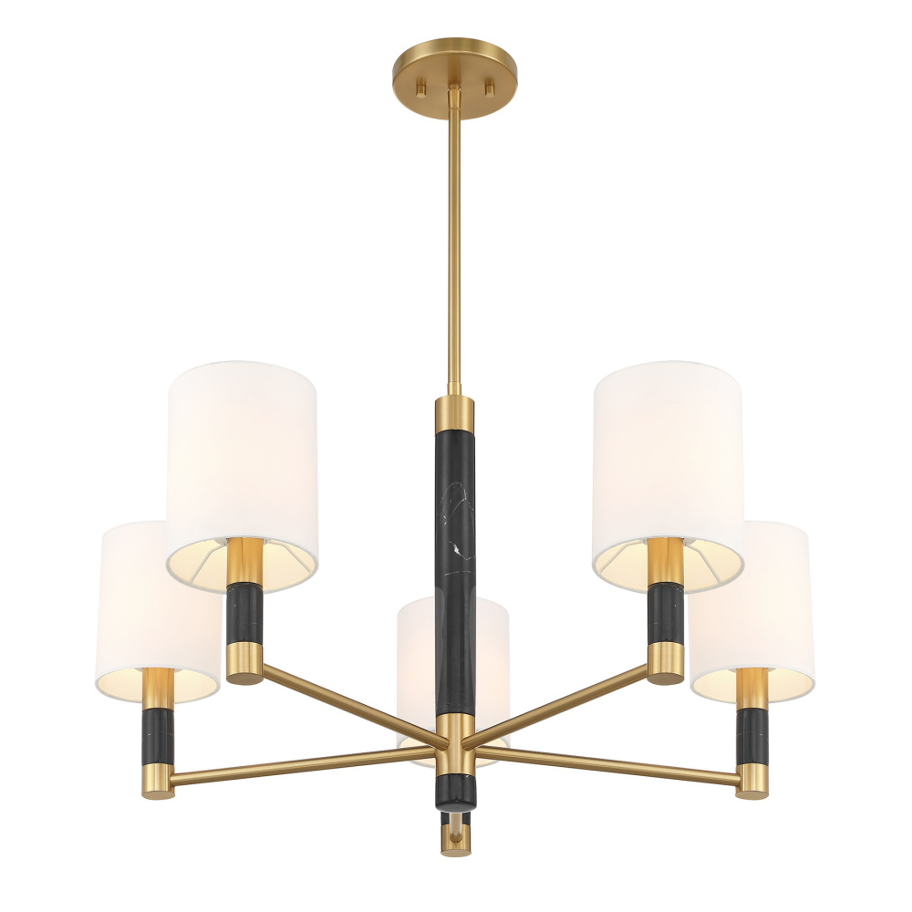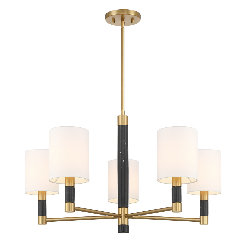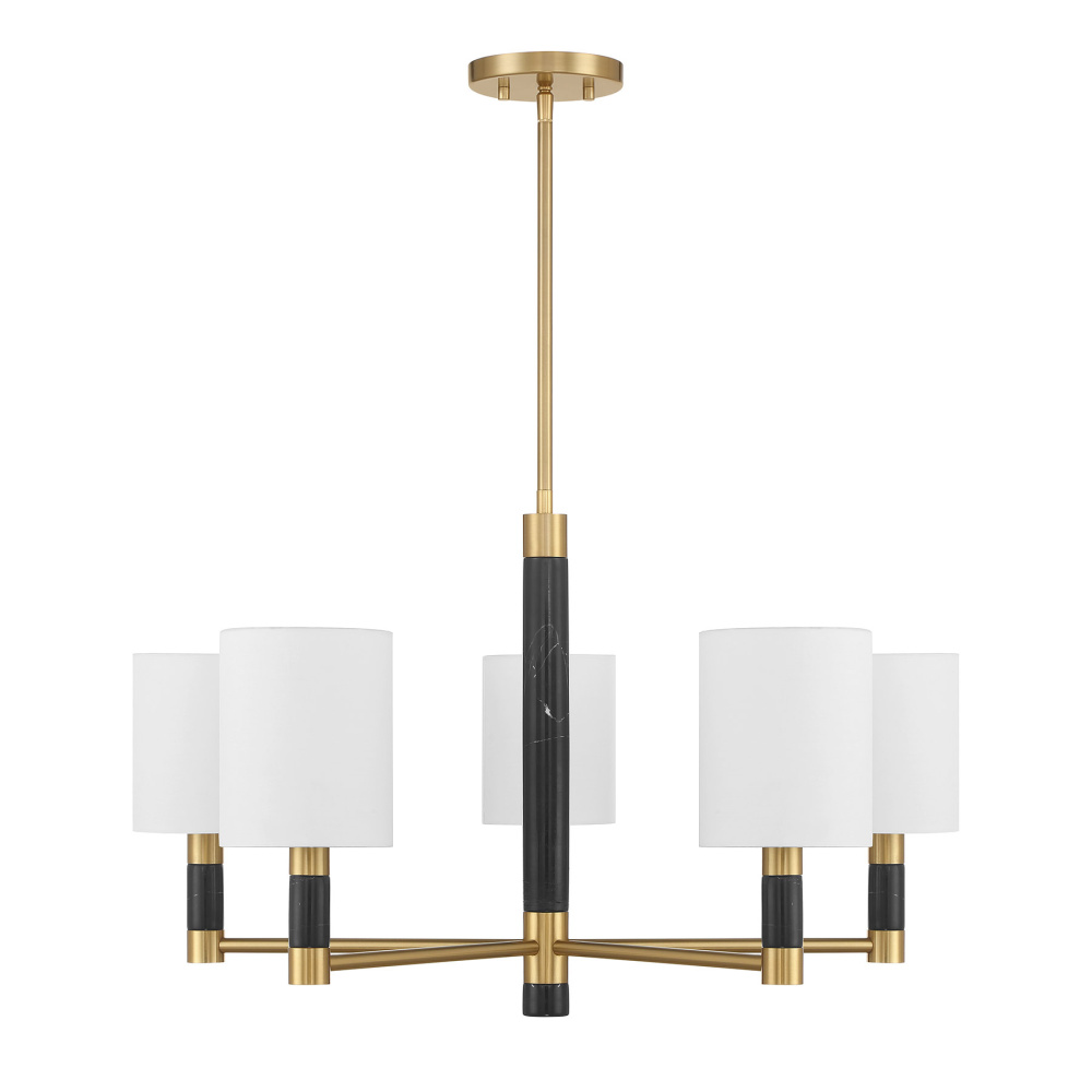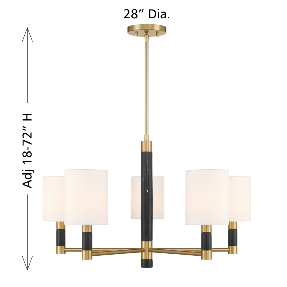 An enduring chandelier shape is adorned with beautiful black marble in the Savoy House Conrad 5-light chandelier, creating a design that will stand the test of time. Each piece of marble is unique and will feature different veining patterns! Crisp white fabric shades and a Warm Brass finish complete the look. Conrad is 18" in height and 28" in width. It uses five candelabra size bulbs of up to 60 watts per bulb. Bulbs not included. Comes with four 12-inch downrods and one 6-inch downrod.
