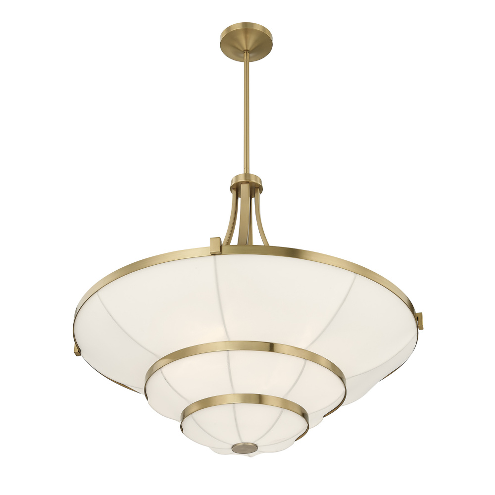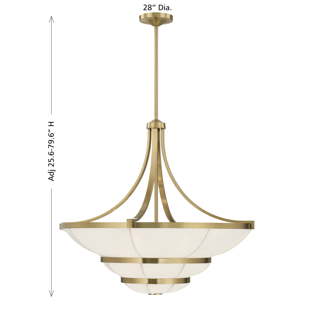 Softly elegant and beautiful, this Savoy House Constantine 4-light chandelier is sure to add warm and welcoming illumination to any location. A three-tiered white fabric shade rises gently outward, adding dimension without heaviness, pairing nicely with the Warm Brass finish. Constantine is 25.625" in height and 28" in width. It uses four standard size bulbs of up to 60 watts per bulb. Bulbs not included. Comes with four 12" downrods and one 6" downrod.