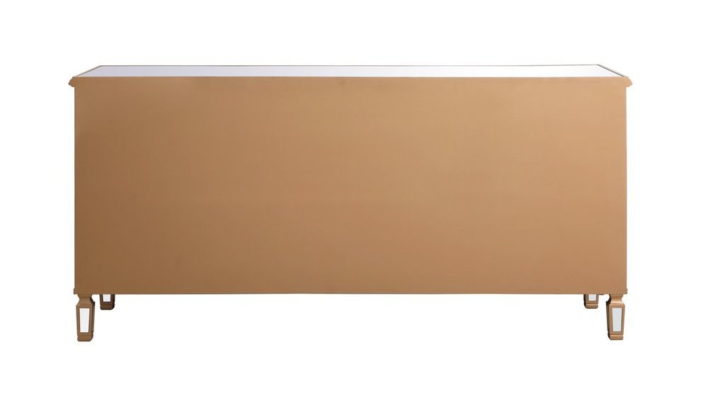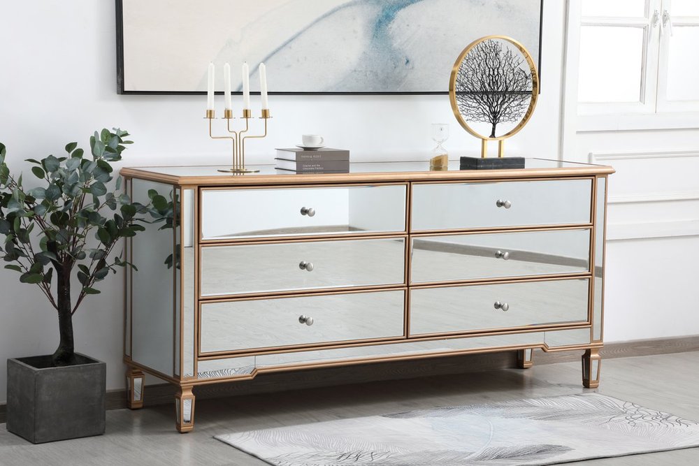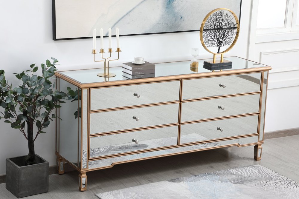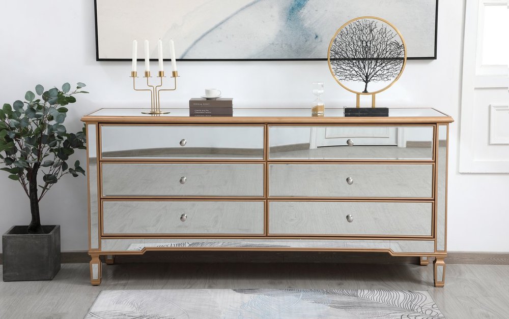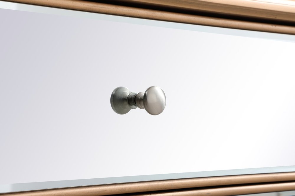 Crafted with mdf, solid wood legs, clear mirror panels, and crystal knobs