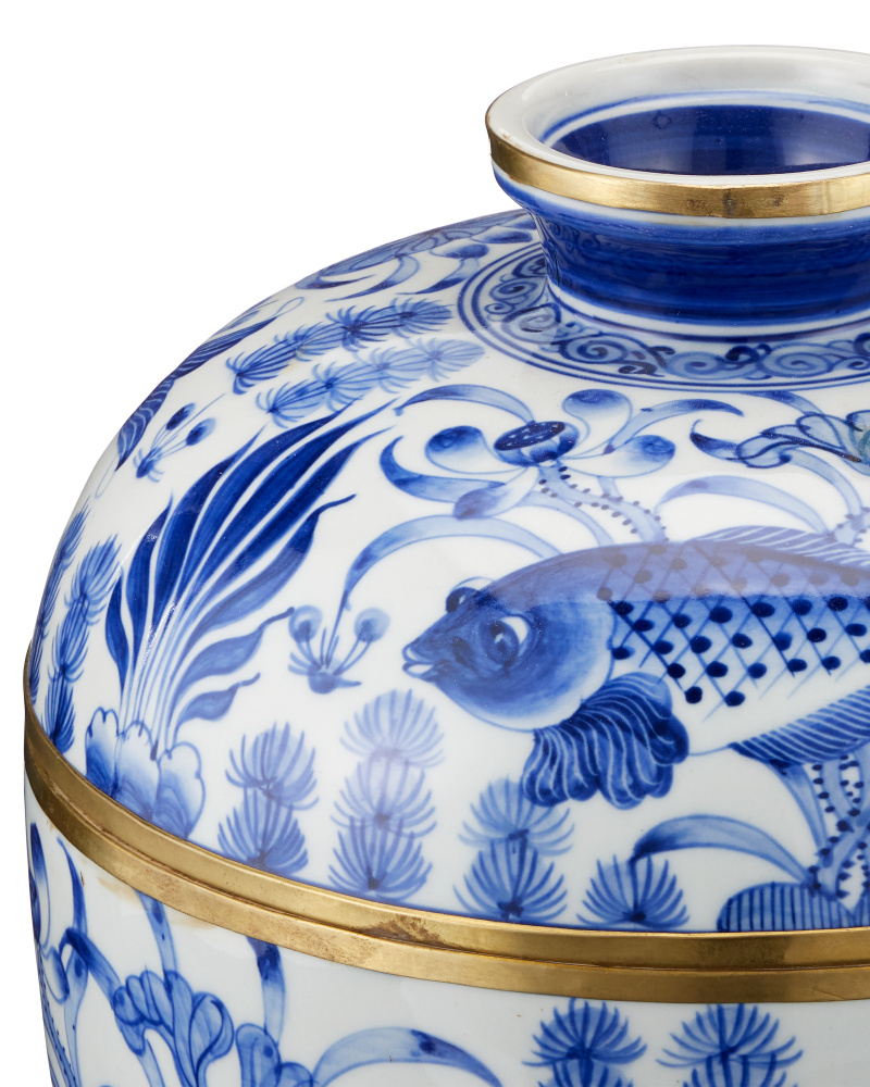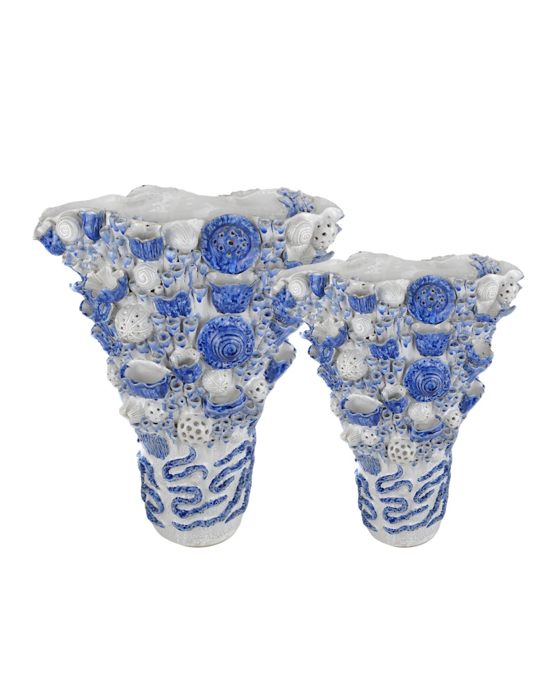 The Coral Reef Medium Vase is made of ceramic glazed in a mix of white and reactive blue. The sea creatures affixed to the sides of the white and blue vase are painstakingly fashioned and applied by hand by a group of women artisans who live at the border of Burma and Thailand.
