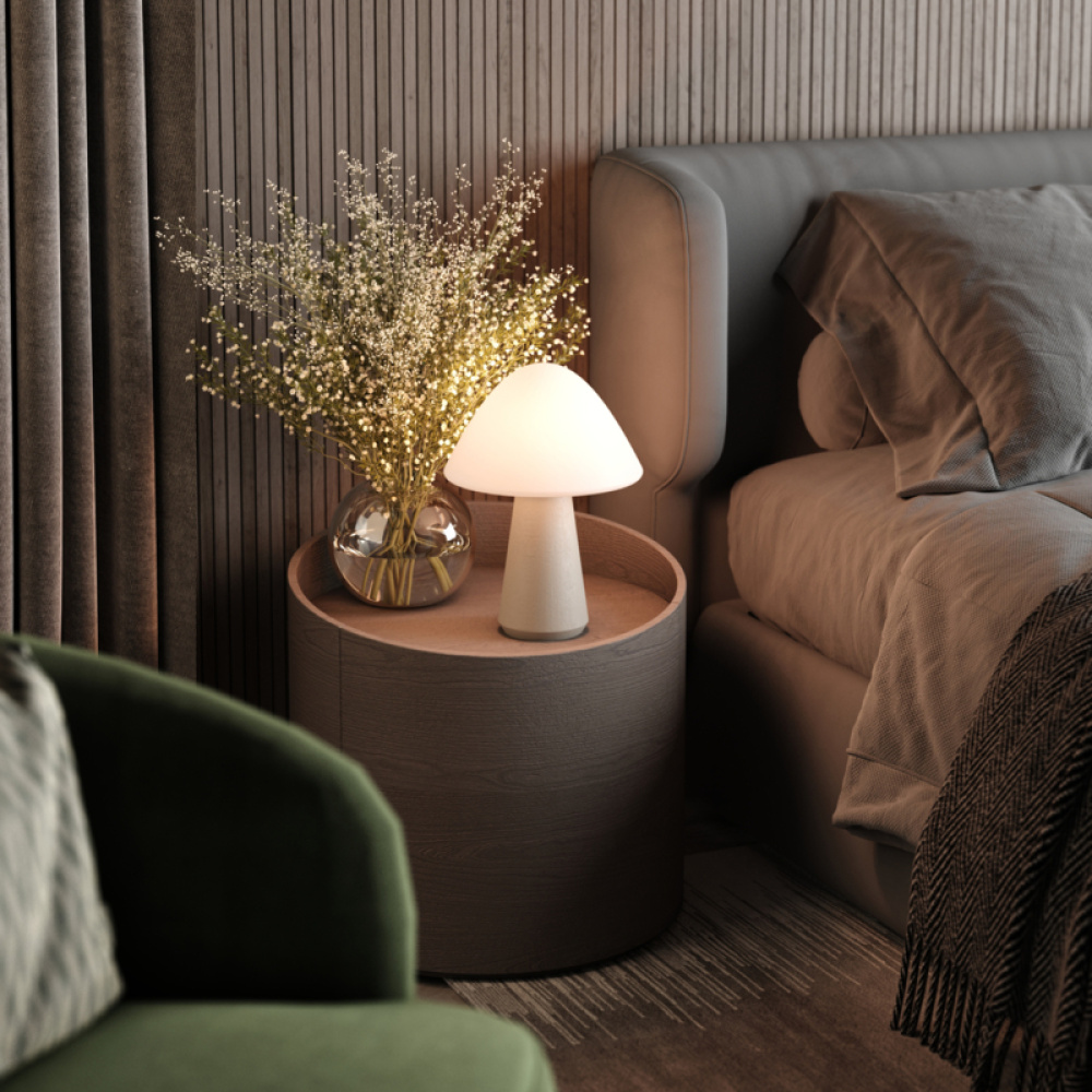 MUSHROOM - where 1960s whimsical design meets contemporary illumination. This delightful accent piece captures the playful essence of iconic mid-century mushroom lamps, reimagined for today's design-conscious spaces. The exquisite cased two-layer opal glass shade creates a mesmerizing soft glow that transforms any environment, while the distinctive cast "color-in" concrete base provides both stability and artistic interest. With its perfectly proportioned dimensions of 8.7" diameter and 12.25" height, MUSHROOM makes a charming yet substantial presence at 4.7 pounds. This portable lighting solution from Kibün by Bulbrite effortlessly moves with you throughout your home, freeing your lighting design from the constraints of outlets and cords. At Kibün by Bulbrite, we've leveraged over 50 years of lighting expertise to create a truly portable lighting solution. MUSHROOM liberates your space from the constraints of cords and outlets, offering remarkable flexibility for both indoor and outdoor settings. Customize your ambient lighting experience with three distinct brightness levels - from a subtle 60-lumen whisper to a room-filling 300-lumen brilliance. The warm white 2700K temperature combined with exceptional 90+ CRI rendering ensures colors appear rich and true beneath MUSHROOM's gentle luminance. Available in four distinctive finishes - classic Off-White, soothing Stone Blue, warm Terracotta, or sophisticated Grey - each MUSHROOM features subtle variations in its concrete base, ensuring your lighting piece is truly one-of-a-kind. Due to the inherent uniqueness of natural stone may feature subtle variations in patterning and coloration, ensuring your lighting piece is truly one-of-a-kind.