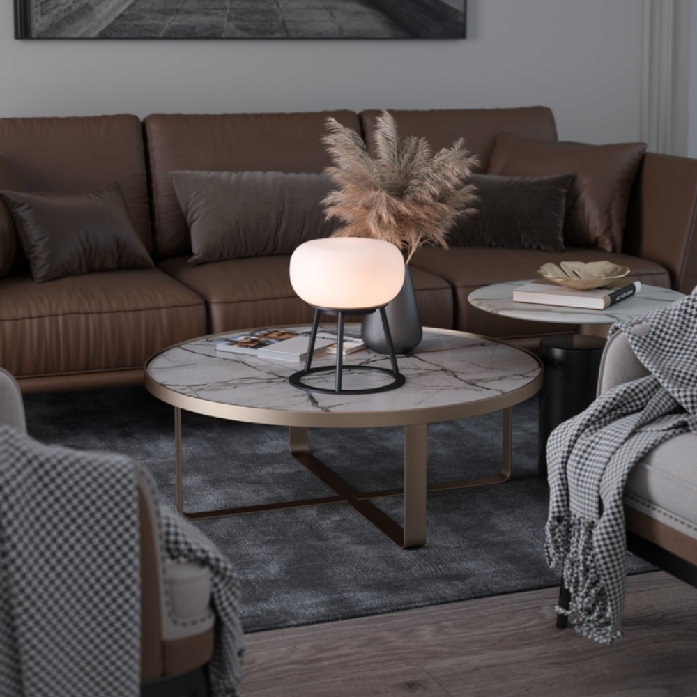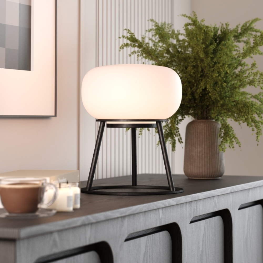 TRIPOD - where sculptural design meets luminous artistry. This statement piece features a striking white oval-shaped glass top delicately poised upon a refined metal tripod frame, creating an architectural silhouette that commands attention. The removable milky glass diffuser distributes light with exceptional evenness, eliminating harsh glare while bathing your space in a gentle, ambient glow. The precision-engineered tripod frame not only provides visual intrigue but offers remarkable stability for this portable indoor lighting solution. At Kibün by Bulbrite, we've leveraged over 50 years of lighting expertise to create a truly portable lighting solution. TRIPOD frees your space from the constraints of cords and outlets, offering remarkable flexibility for both indoor and outdoor settings. Experience customizable brilliance with three illumination levels - from subtle 60-lumen ambiance to brilliant 300-lumen task lighting. The 2700K warm white temperature and exceptional 90+ CRI ensures colors appear rich and true to life under TRIPOD’s gentle radiance. With substantial dimensions of 12" diameter and 14.75" height, TRIPOD makes a confident design statement at 11.2 pounds. Select from two timeless finishes - sophisticated Black or luxurious Brushed Brass - to complement your interior aesthetic.