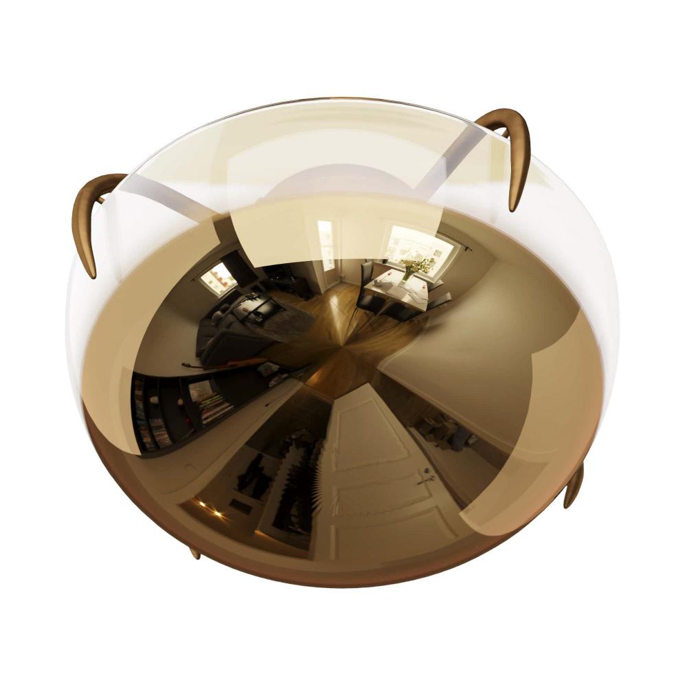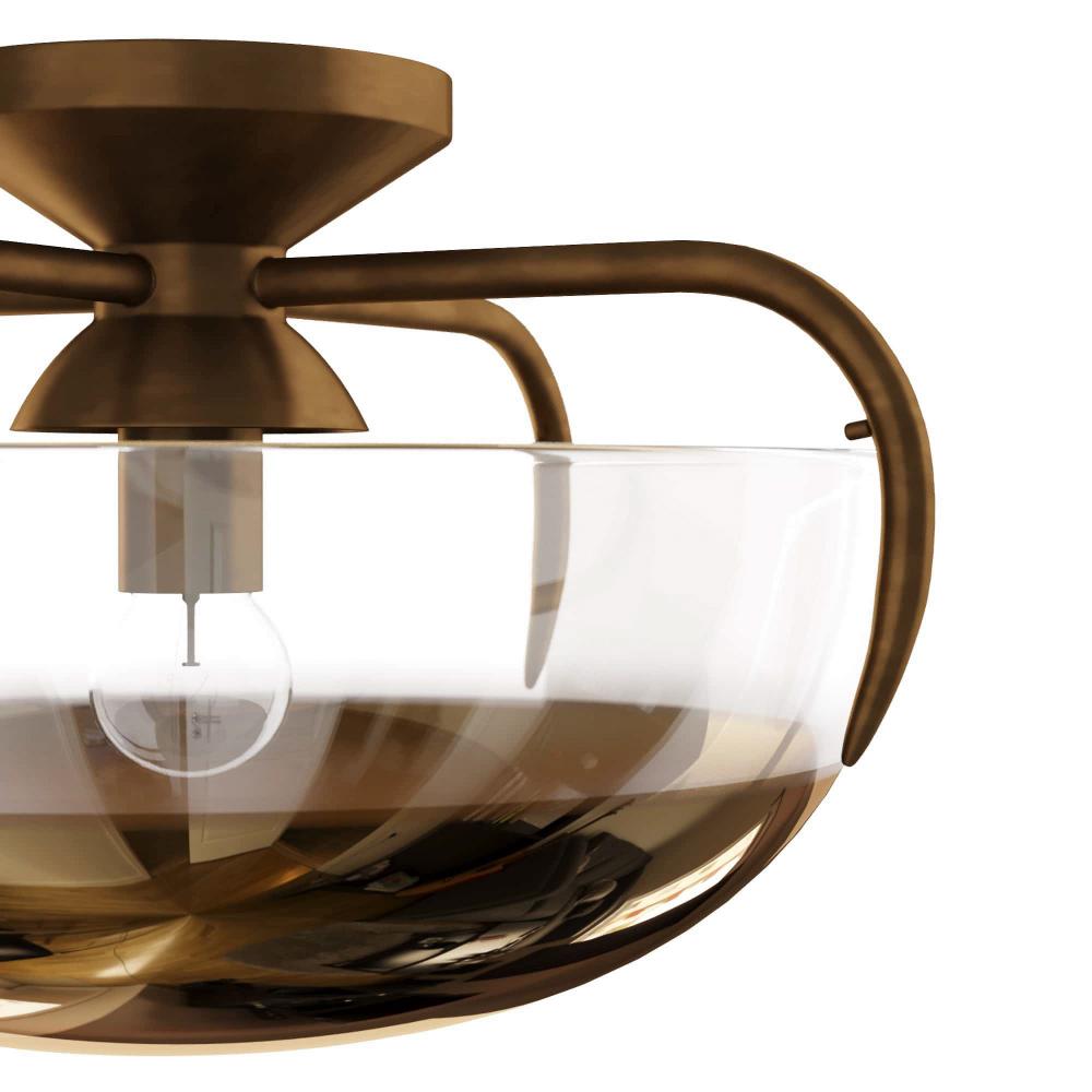 CONTEMPORARY GLAM WITH ORGANIC SENSIBILITIES. THIS SMALL ANTIQUE BRASS FLUSH MOUNT CASTS A LARGE SHADOW AND LIGHT EFFECT ON THE CEILING DUE TO THE GOLD OMBRE GLASS. PERFECT FOR POWDER ROOMS AND HALLWAYS, OR USE IN AN ASYMMETRIC CLUSTER OVER TABLES AND COUNTERS. FINISH WILL VARY.