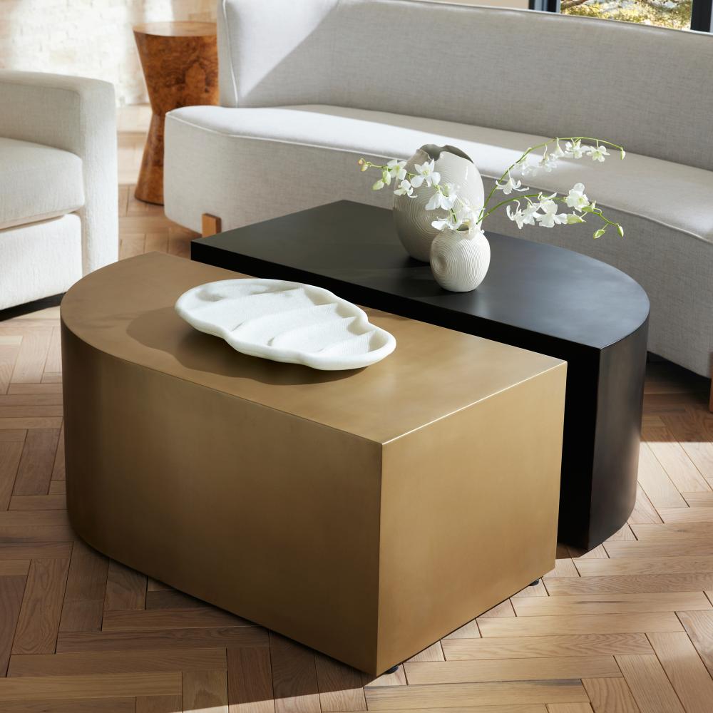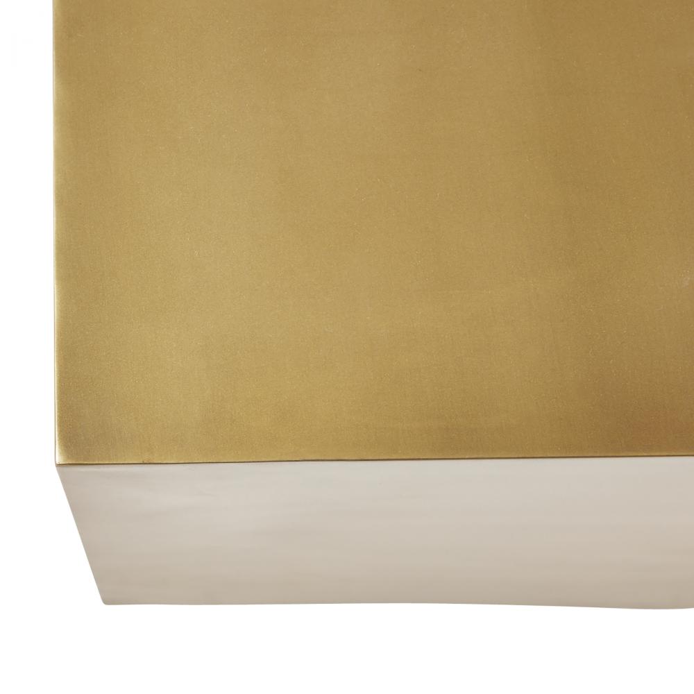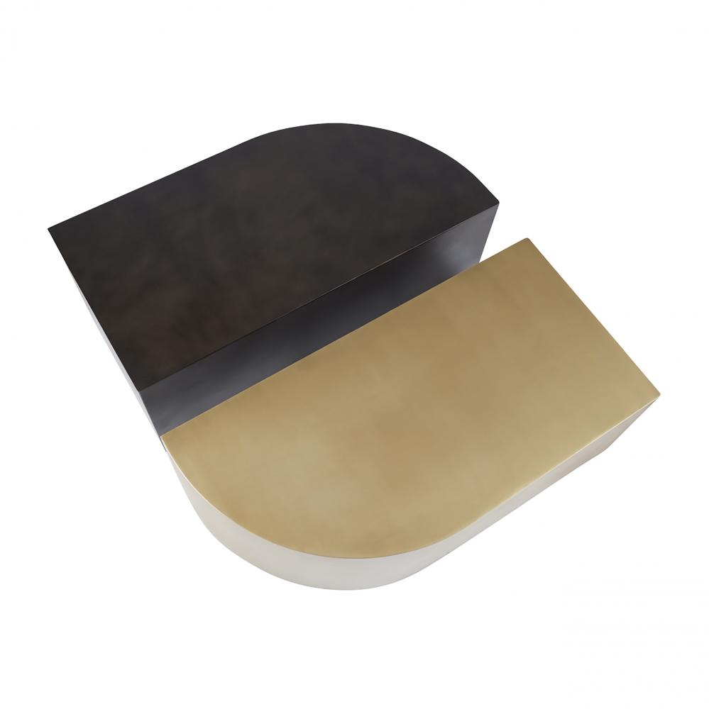 A monolithic cocktail table of antique brass plated iron is elegant alone, and even more dynamic when paired with its bronze-plated mate. Designed to float in a space, the purely modern form is always essential, never extraneous.