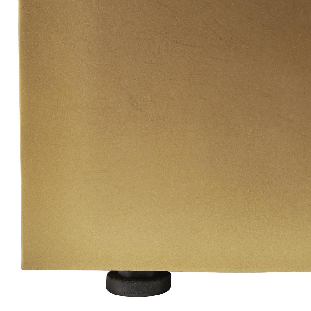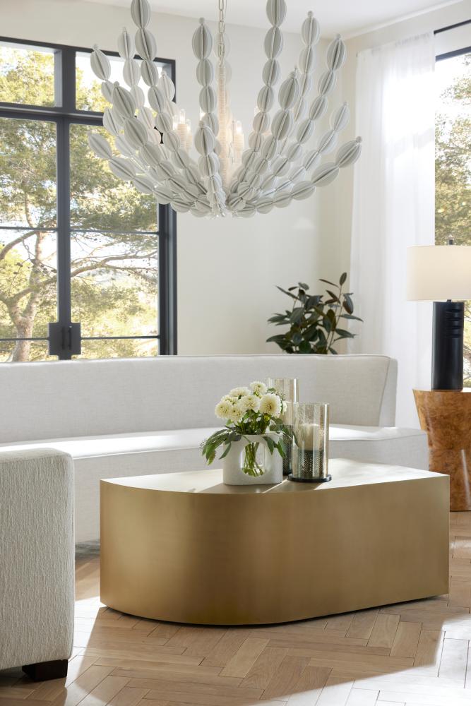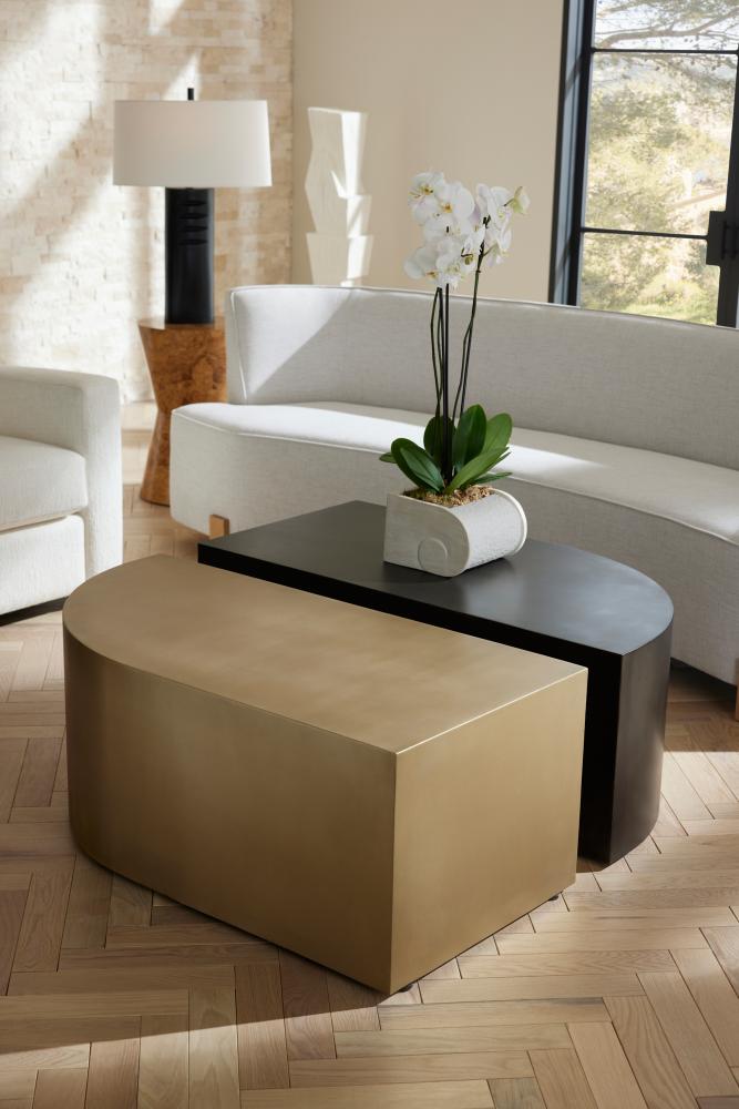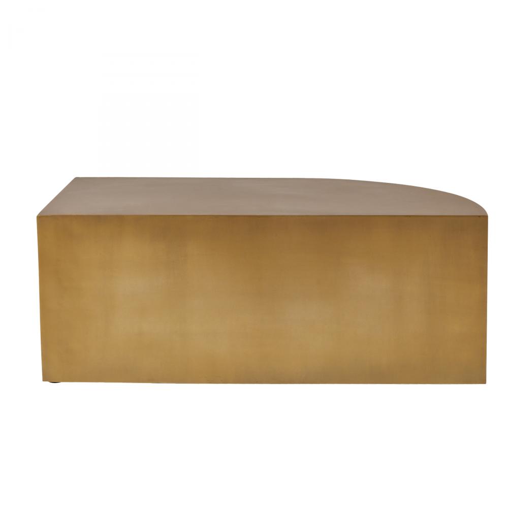 A monolithic cocktail table of antique brass plated iron is elegant alone, and even more dynamic when paired with its bronze-plated mate. Designed to float in a space, the purely modern form is always essential, never extraneous.