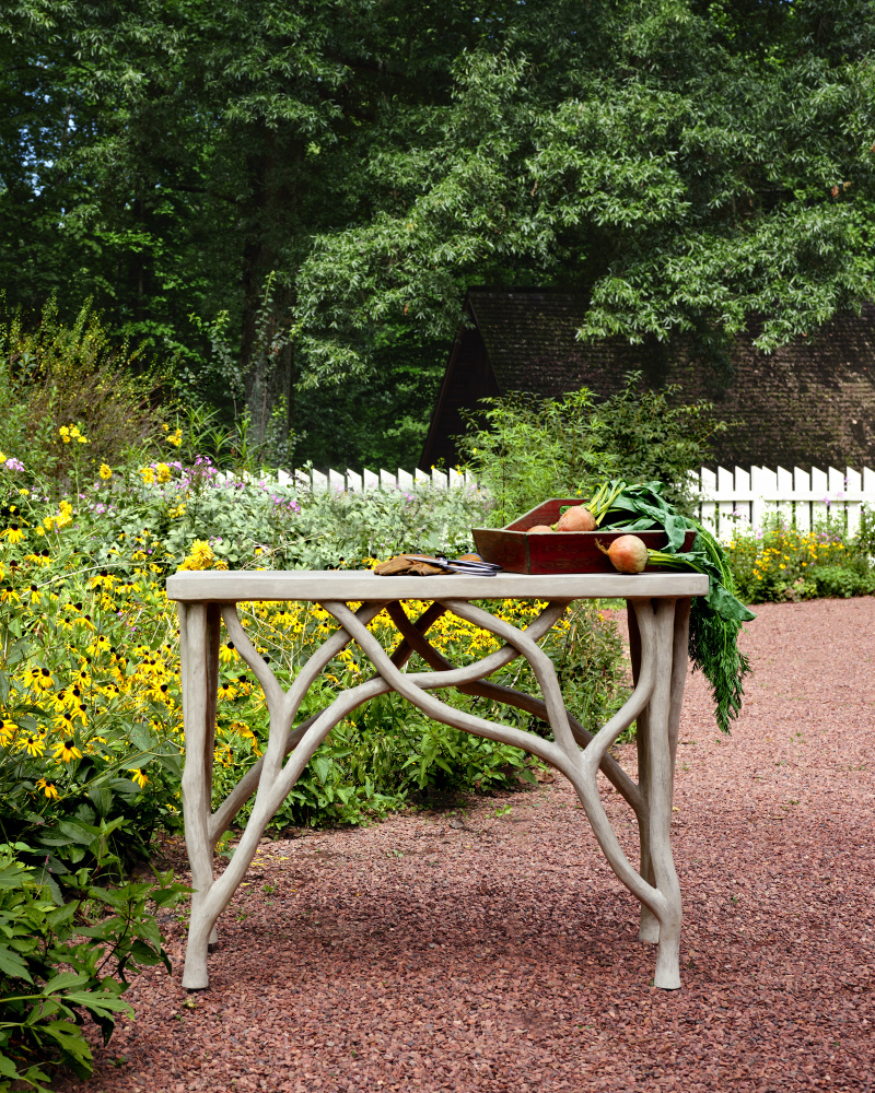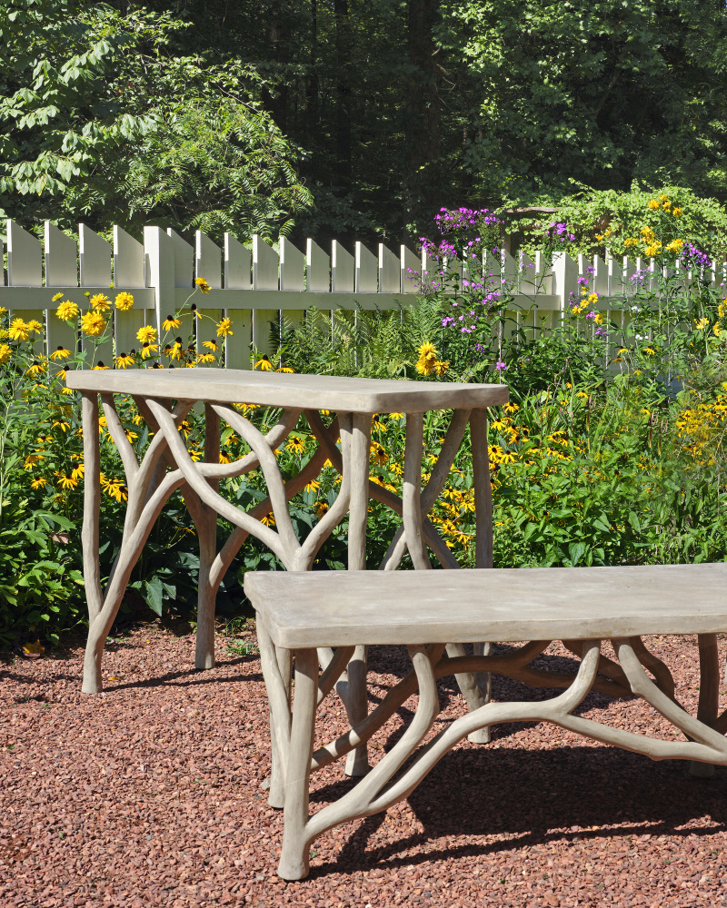 The flowing twig-like details on the Creekside Console Table were realized with faux bois construction techniques. The graceful branching profile makes this table in a faux bois natural finish a veritable sculpture in a space, be it indoors or out. We also offer the Creekside as a table/bench.