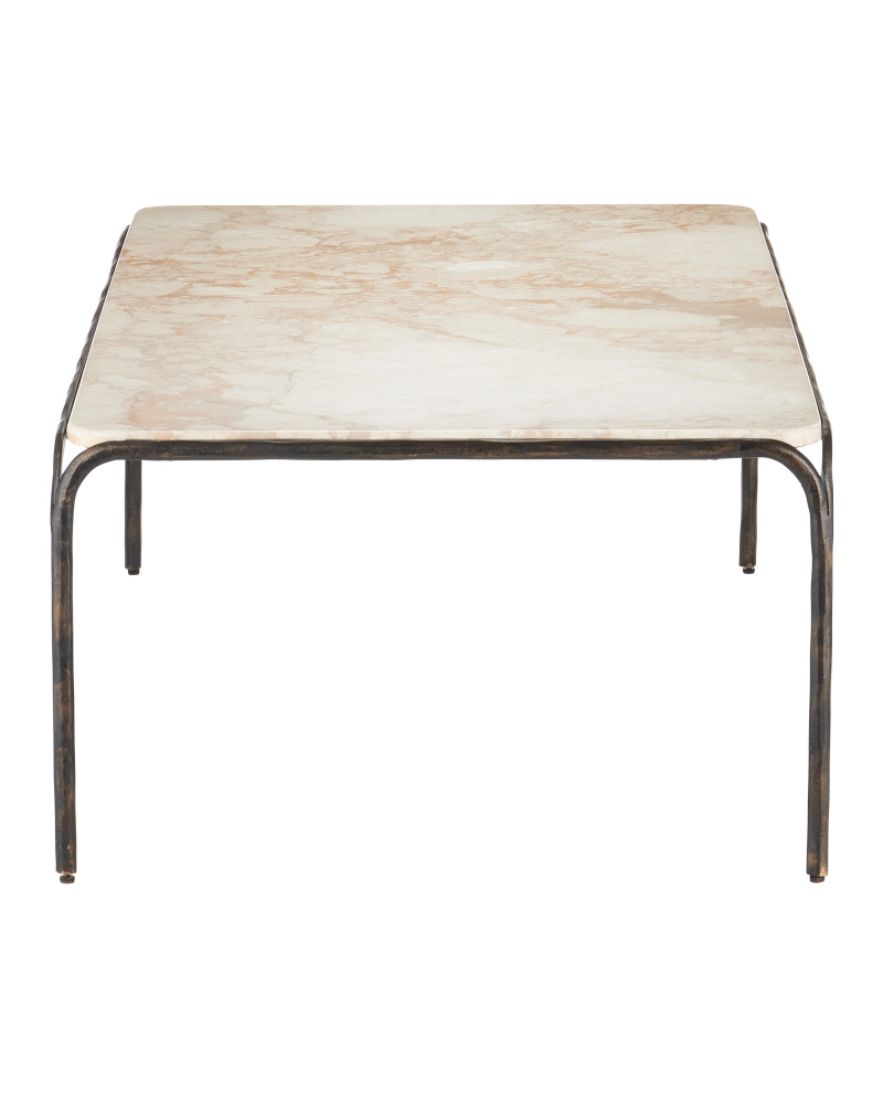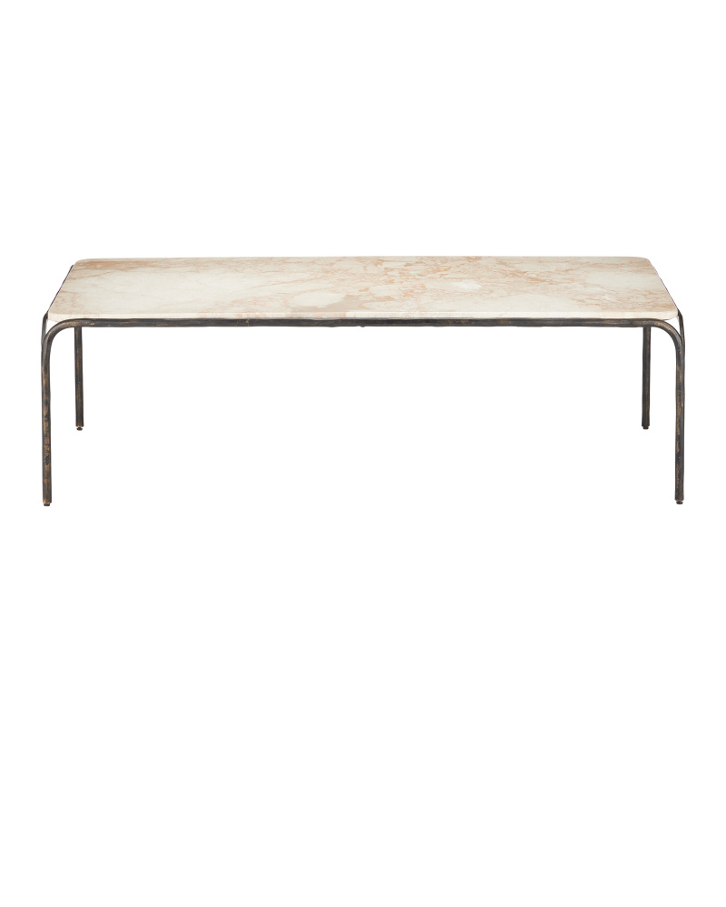 The Crema Cocktail Table combines industrial elegance with artisanal craftsmanship. Its metal frame, finished in a warm bronze, has a hand-forged appearance that adds depth to its streamlined silhouette. Supporting a luxurious crema marble top, the frame folds down and away at the corners, creating a striking forked design that echoes the refined detail found at the ends of the stretcher where it meets the legs. This is a sizeable table at 54 inches long.