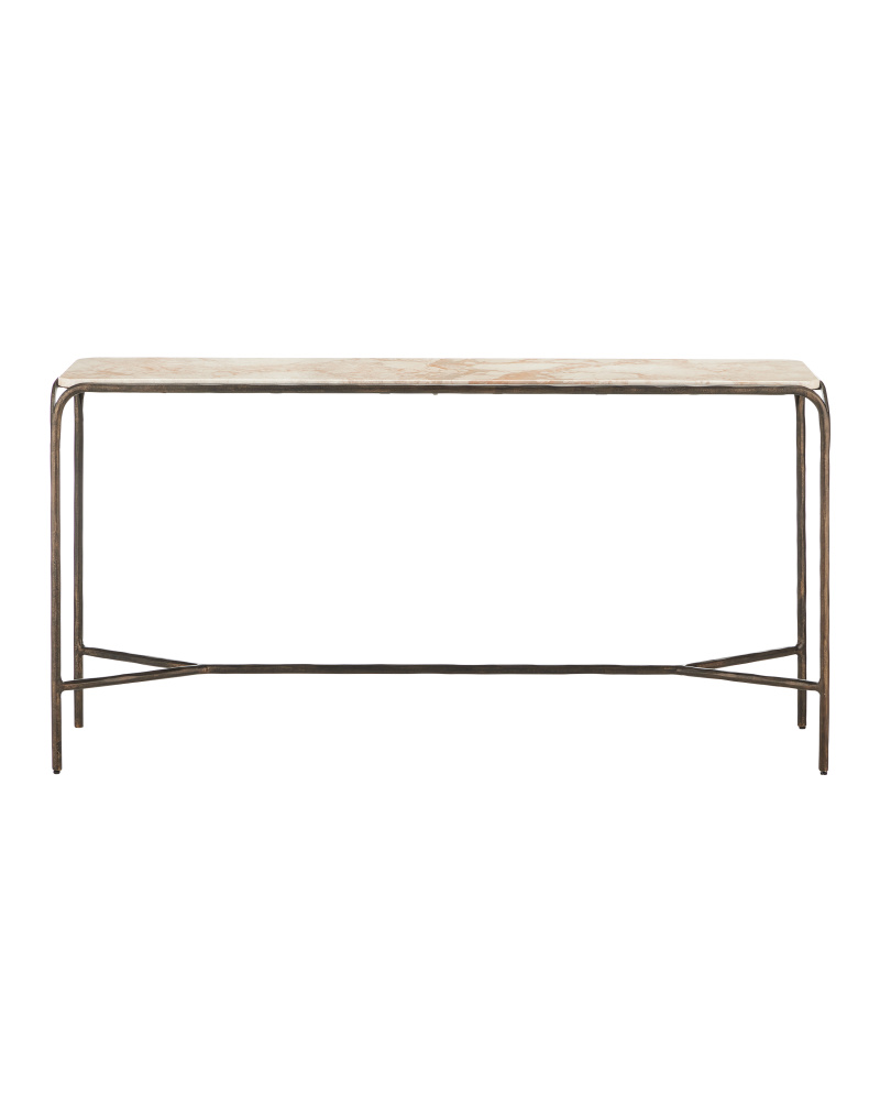 The Crema Console Table combines industrial elegance with artisanal craftsmanship. Its metal frame, finished in a warm bronze, has a hand-forged appearance that adds depth to its streamlined silhouette. Supporting a luxurious crema marble top, the frame folds down and away at the corners, creating a striking forked design that echoes the refined detail found at the ends of the stretcher where it meets the legs. This is a sizeable table at 60 inches long.