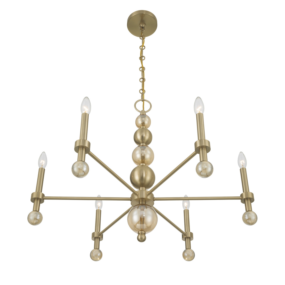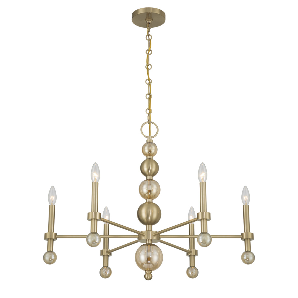 Style bubbles over in the Savoy House Crescent 6-light chandelier, delivering a look worth celebrating. Globes of champagne-hued glass shimmer with effervescent charm as the Noble Brass finish adds an extra layer of radiance. Crescent is 23.63" in height and 30" in width. It uses six candelabra size bulbs of up to 60 watts per bulb. Bulbs not included. Comes with 120" of chain.