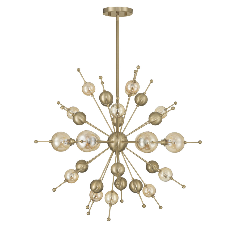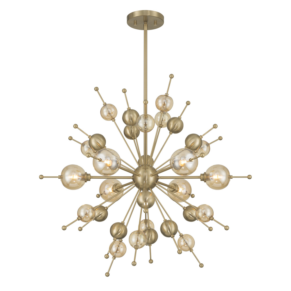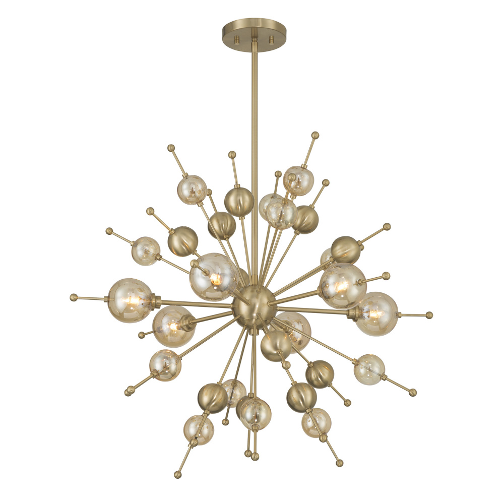 Style bursts forth in the Savoy House Crescent 6-light chandelier, showcasing champagne-hued glass accents on a sleek Sputnik-style frame. The Noble Brass finish heightens the glamour, creating a look that feels celebratory from every angle. Crescent is 28.5" in width and has an adjustable height ranging from 26" to 68". It uses six G9 bulbs of up to 60 watts per bulb. Bulbs not included. Comes with four 12" downrods and one 6" downrod.