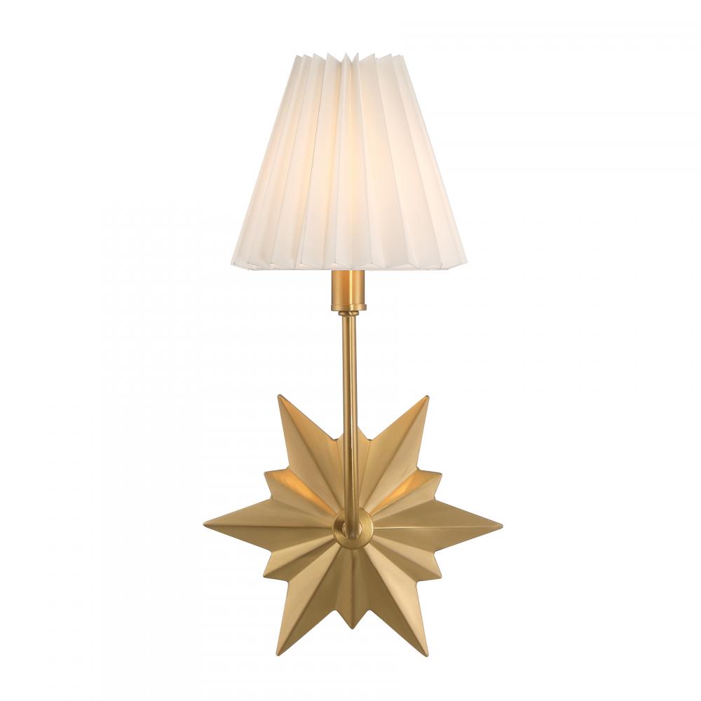 A starburst-shaped backplate shines beautifully in this Savoy House Crestwood 1-light sconce, creating a lovely look that imparts any space with a touch of midcentury-inspired style. The white pleated shade and Warm Brass finish are a perfect pairing. Crestwood is 15.75" in height, 8" in width and extends 9.5" from the wall. Uses one candelabra size bulb of up to 60 watts. The bulb is not included. Damp area rated.