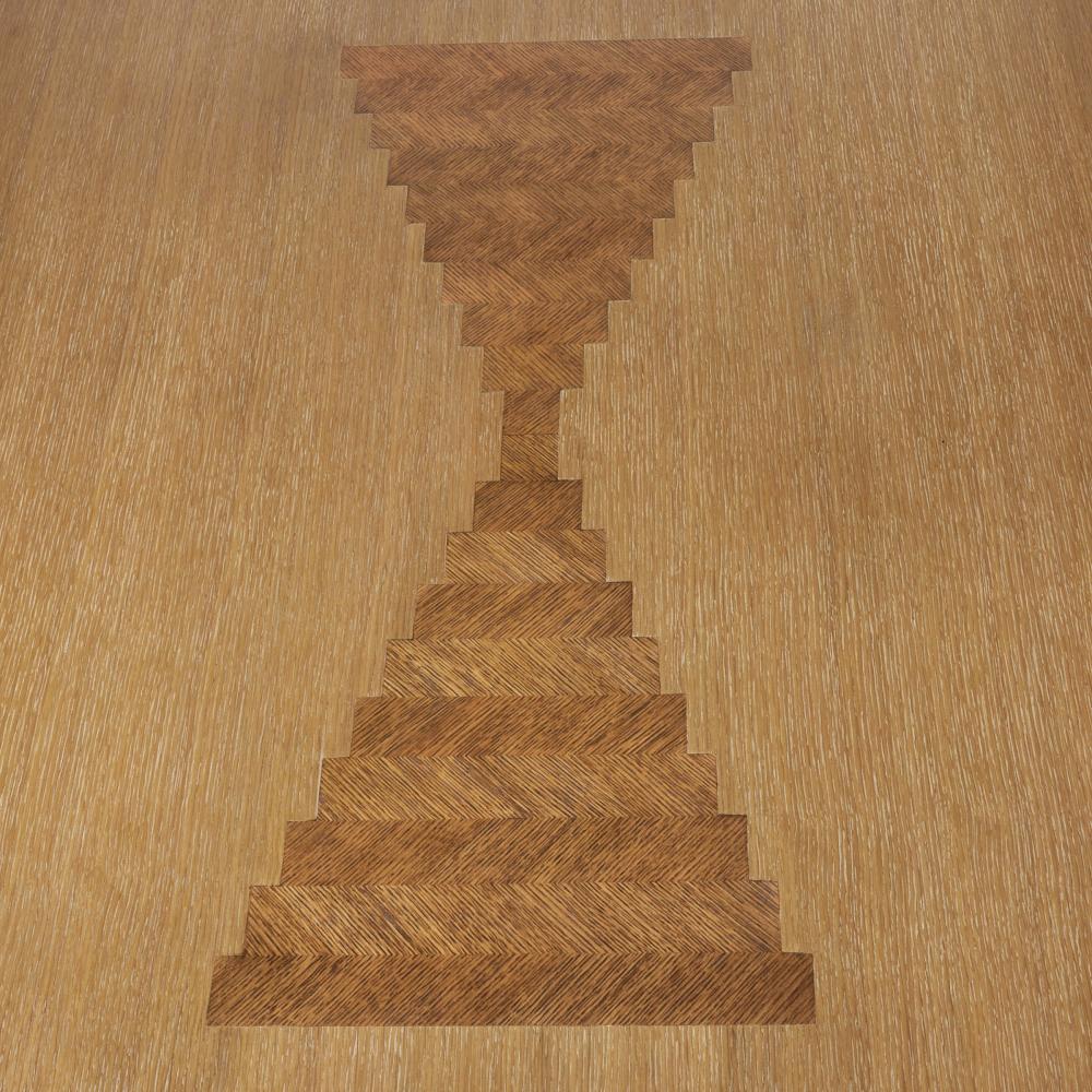 We over scaled the dimensions of a rectangular pedestal table to make it a monumental centerpiece. A stepped, reversed pyramid base offers a ceremonial quality, while the oyster-finished oak veneer top is luxuriously detailed with intriguing, mirrored insets of dark oyster oak veneer. Finish will vary.