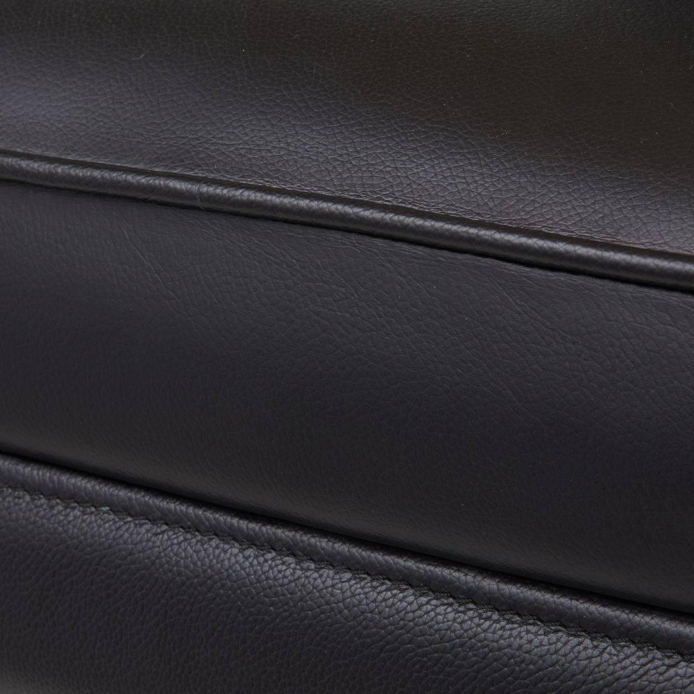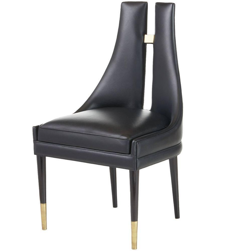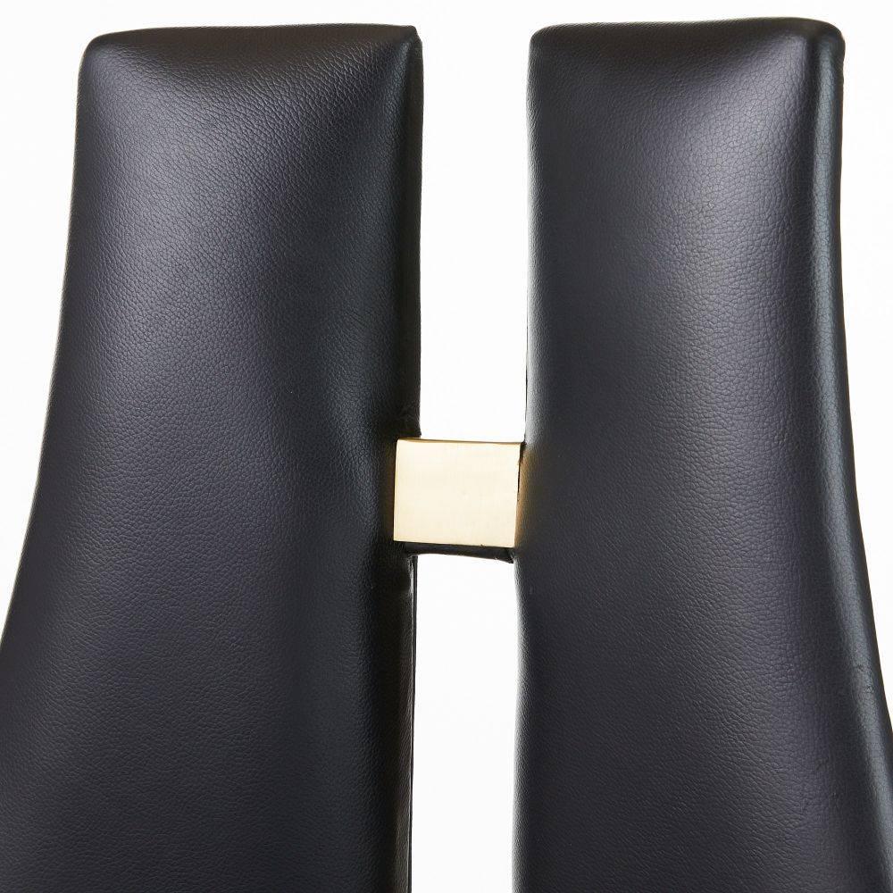 The ideal balance of masculine and feminine, a sleek slit detail mimics an alluring open-backed dress. Soft black leather upholstery is enhanced with polished antique brass joinery. Poised on slim, ebony beech wood legs tipped in brass. Leather will vary.