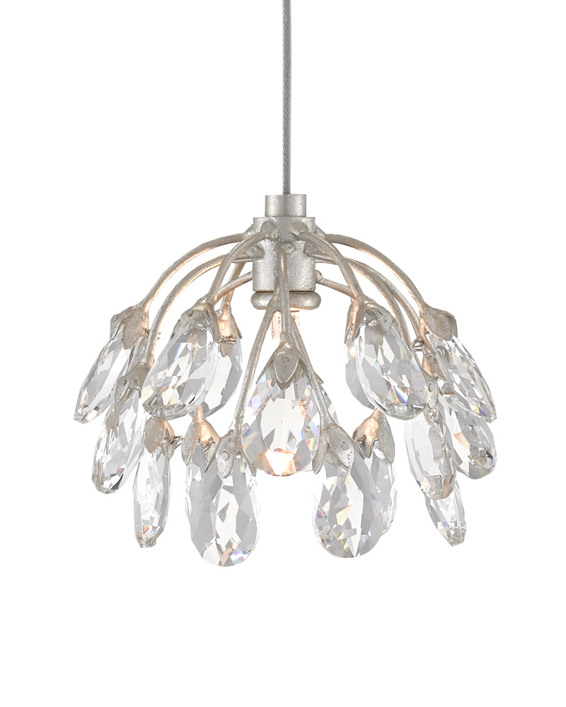 The Crystal Bud Round 15-Light Multi-Drop Pendant dangles flowers made of delicate faceted crystals from its canopy to make the shades effervescent and graceful. The canopy of this piece is luminous in a painted silver finish. This fixture is among Currey & Company's multi-drop pendant collection, which includes multiple configurations.